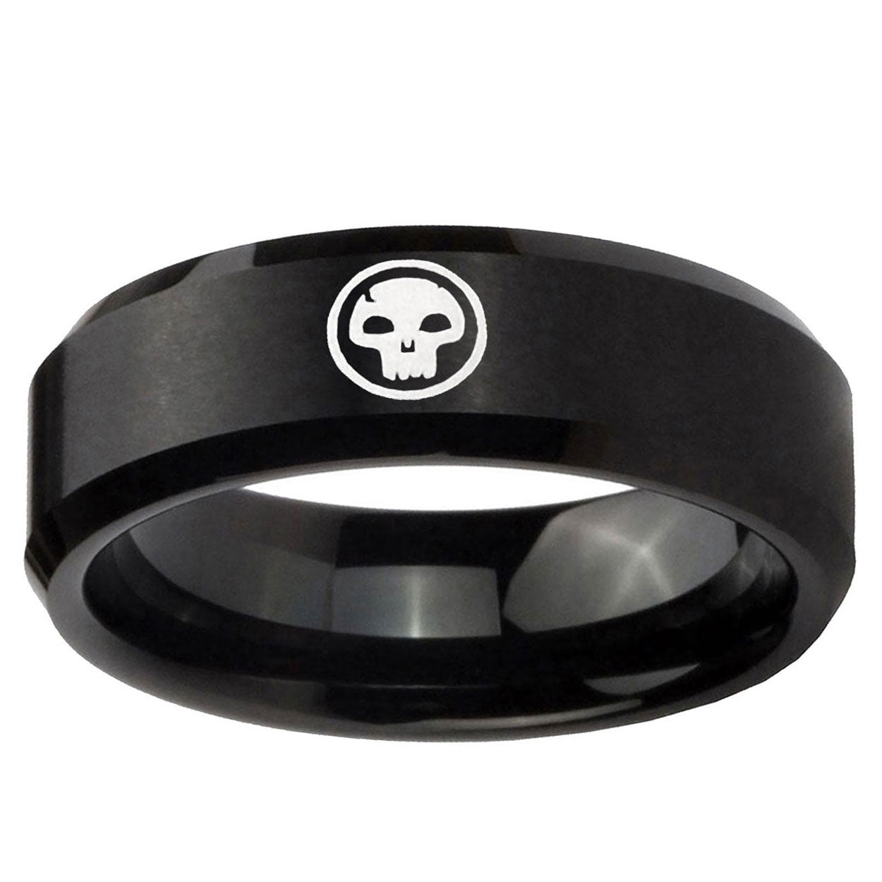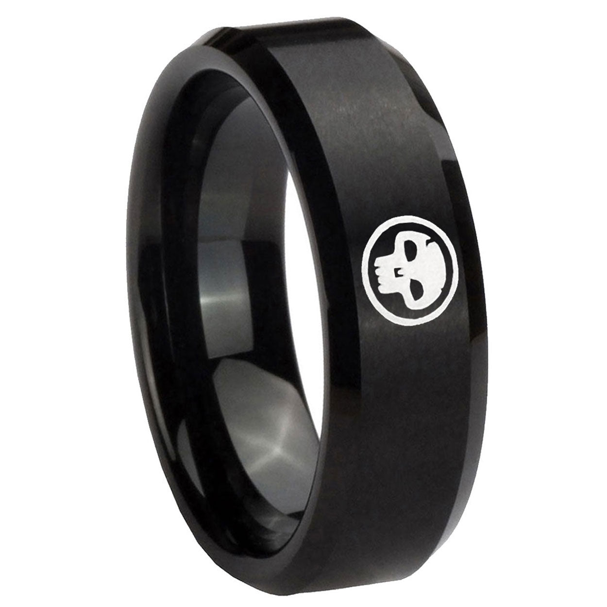 Intruding 5, 8mm Skull Beveled Edges Brush Black Tungsten Carbide Men's Engagement Band . Offer in both 5mm and 8mm band width brushed black plated finished from size 4 to 14