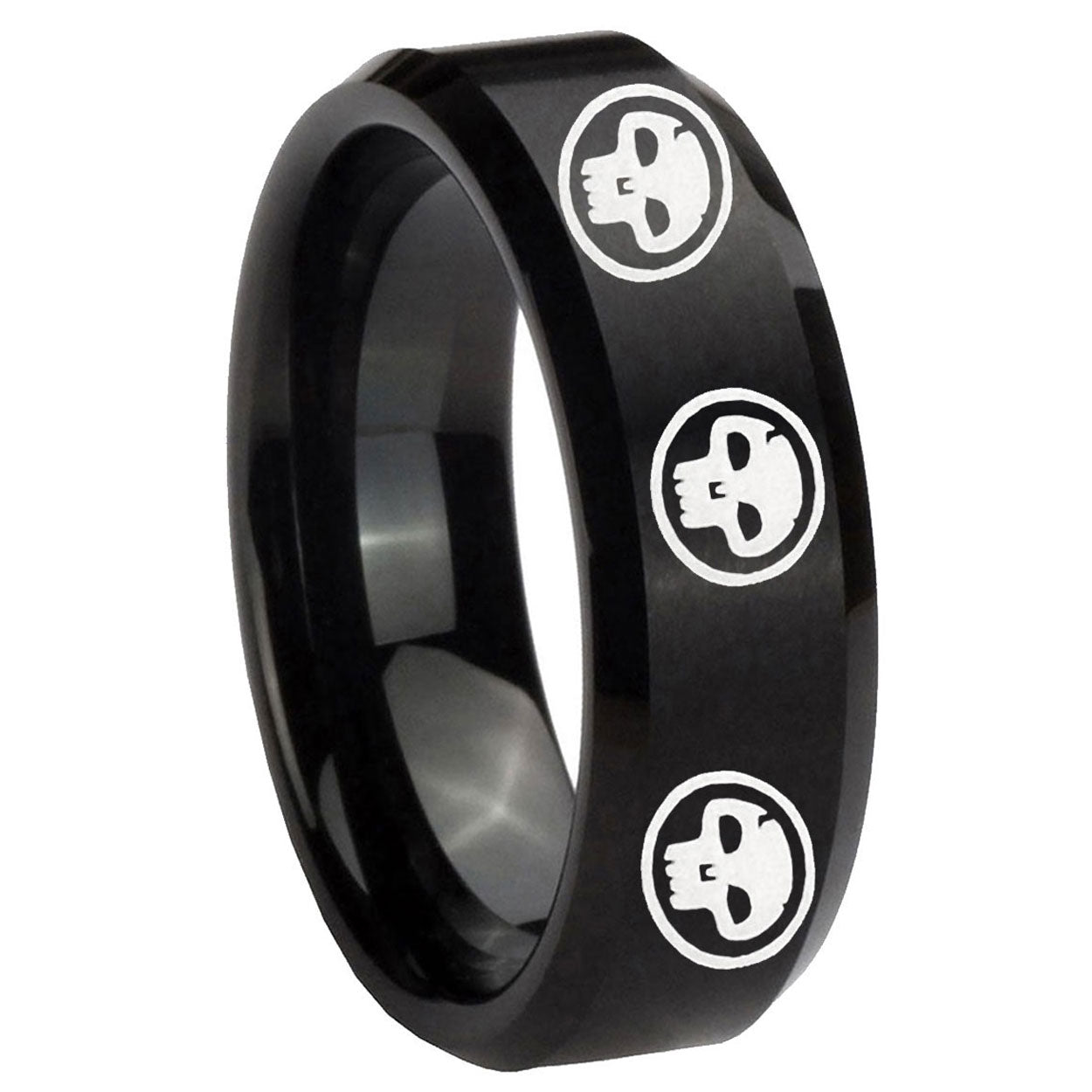 Propose with the 10mm Multiple Skull Beveled Edges Brush Black Tungsten Men's Engagement Ring. This brushed black tungsten ring with Multiple Skull design is ideal for engagements.
