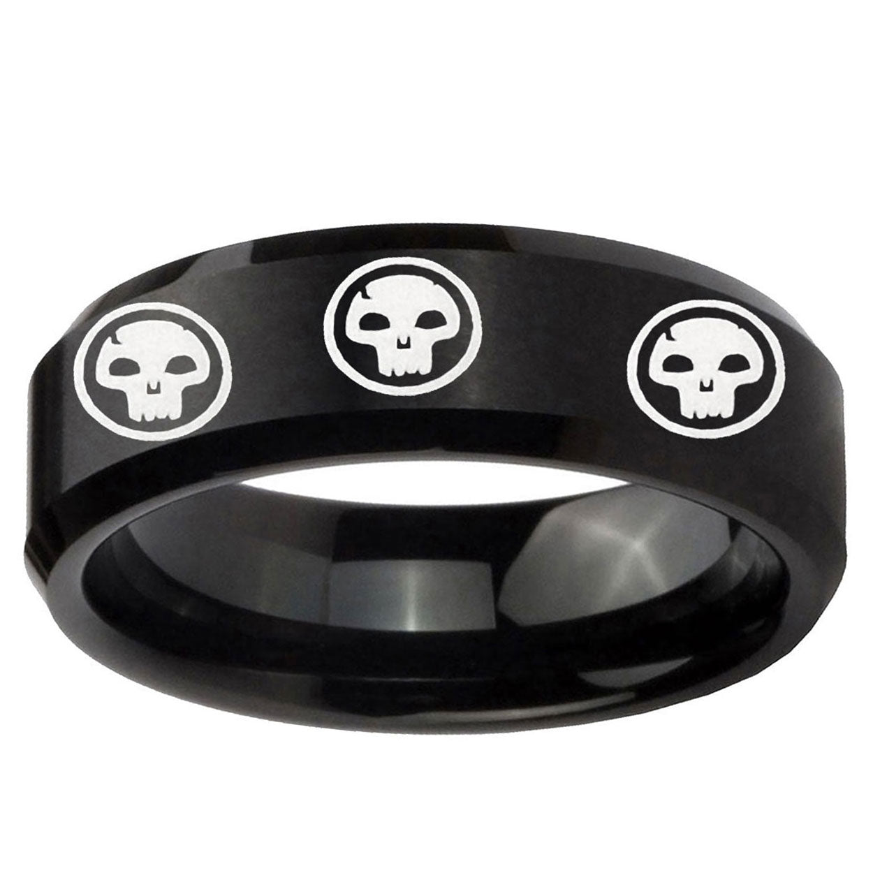 10mm Multiple Skull Beveled Edges Brush Black Tungsten Men's Engagement Ring