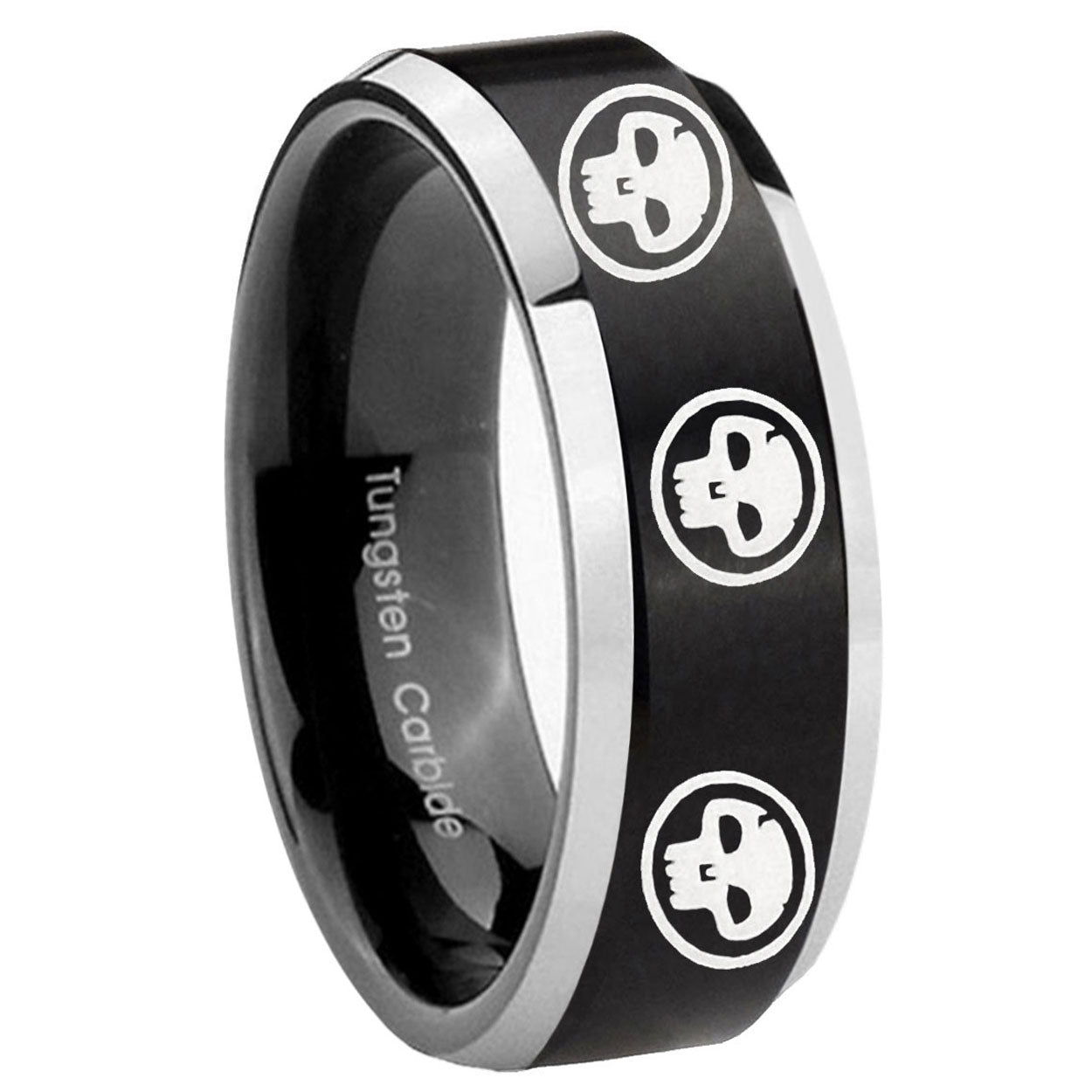 10mm Multiple Skull Beveled Brush Black 2 Tone Tungsten Mens Ring Engraved