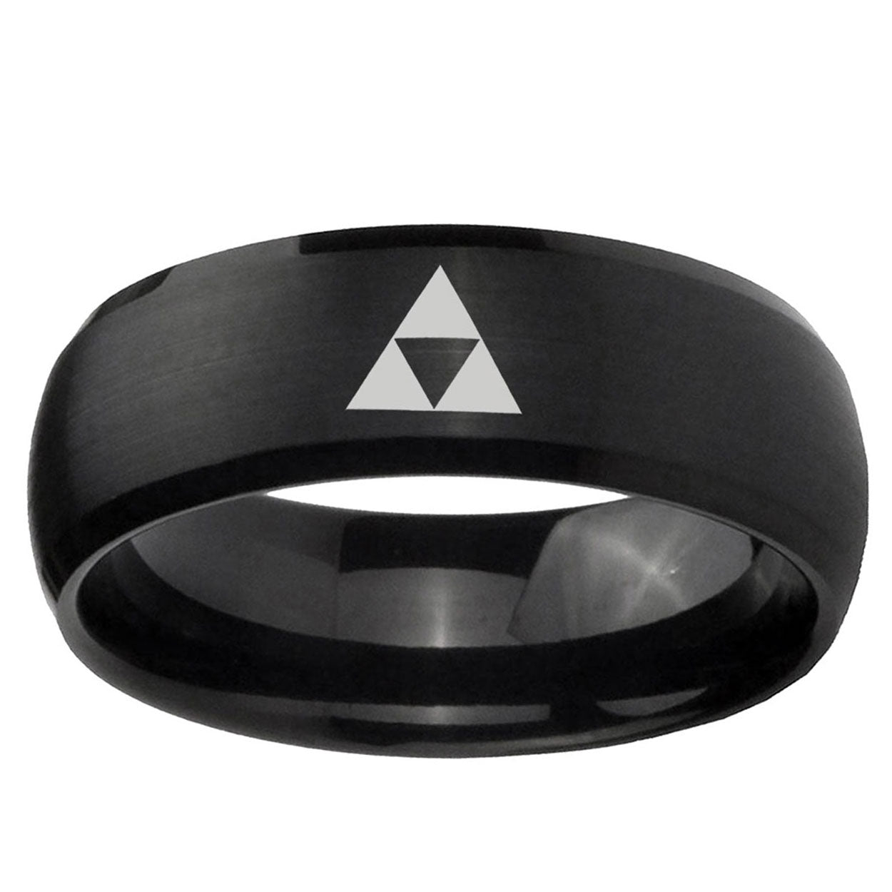 Intruding 5, 8mm Zelda Triforce Dome Brush Black Tungsten Carbide Men's Bands Ring . Offer in both 5mm and 8mm band width brush black plated finished from size 4 to 14