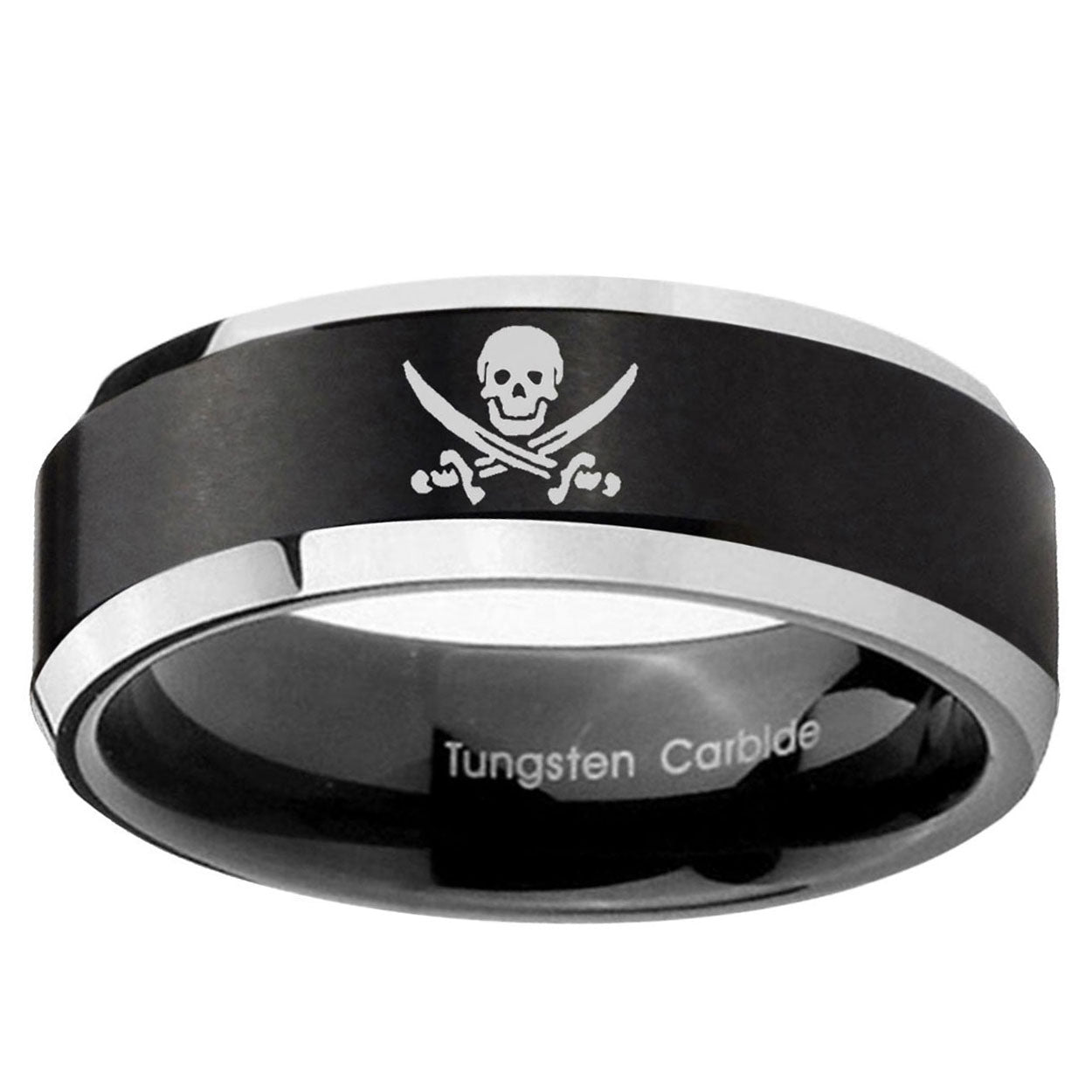 Intruding 5, 8mm Skull Pirate Beveled Edges Brush Black 2 Tone Tungsten Wedding Band Ring . Offer in both 5mm and 8mm band width brushed black plated 2 tone finished from size 4 to 14