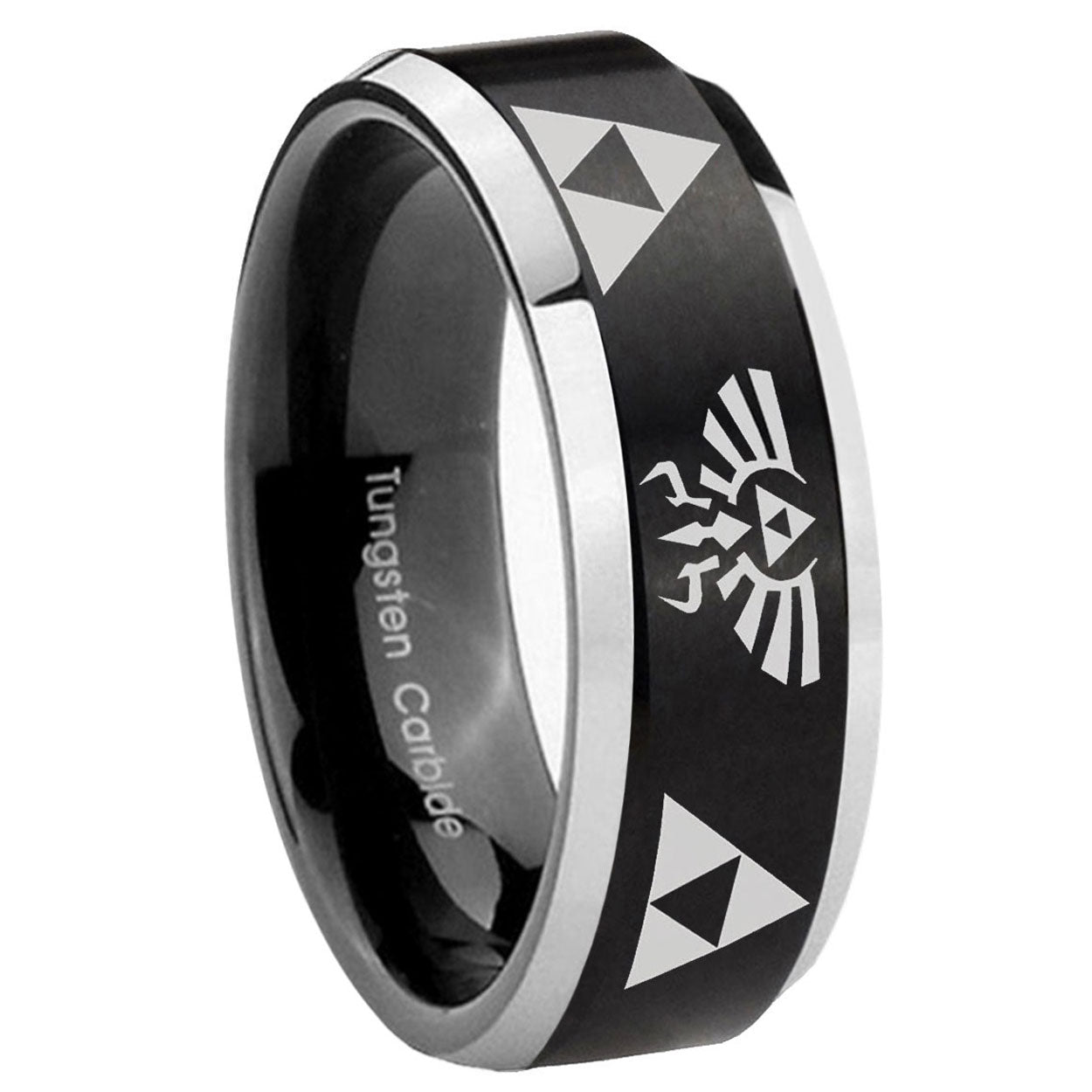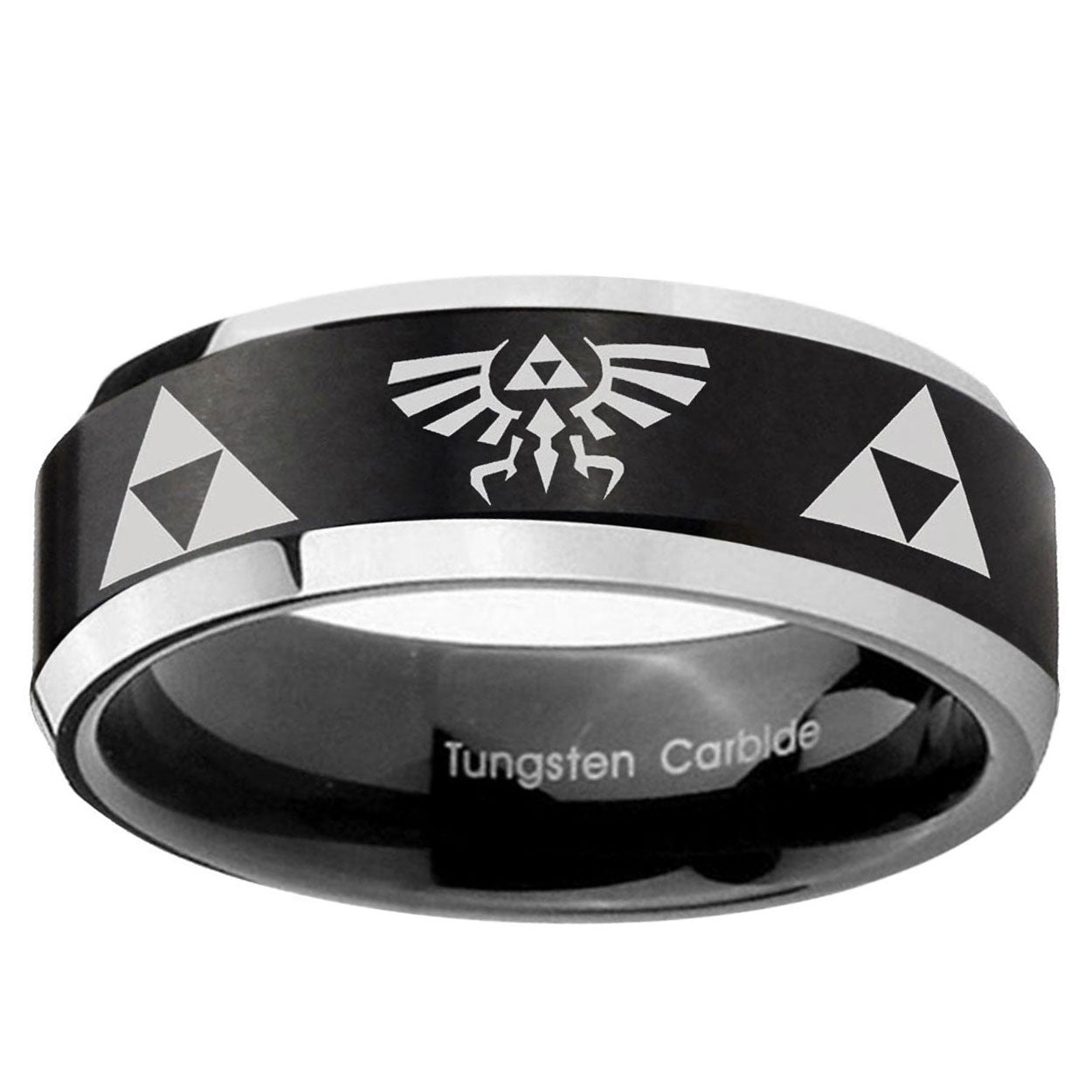 Personalize the 10mm Legend of Zelda Beveled Brush Black 2 Tone Tungsten Wedding Engraving Ring. This brushed black and 2-tone tungsten ring with Legend of Zelda design is perfect for custom engravings.