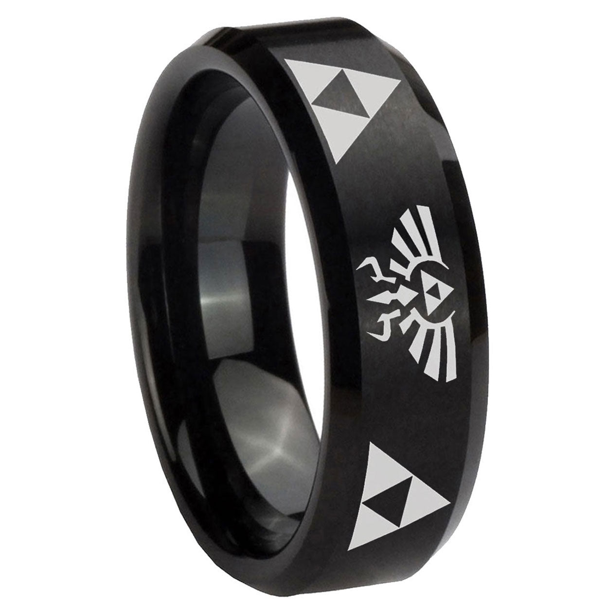 Intruding 5, 8mm Legend of Zelda Beveled Edges Brush Black Tungsten Carbide Promise Ring . Offer in both 5mm and 8mm band width brushed black plated finished from size 4 to 14
