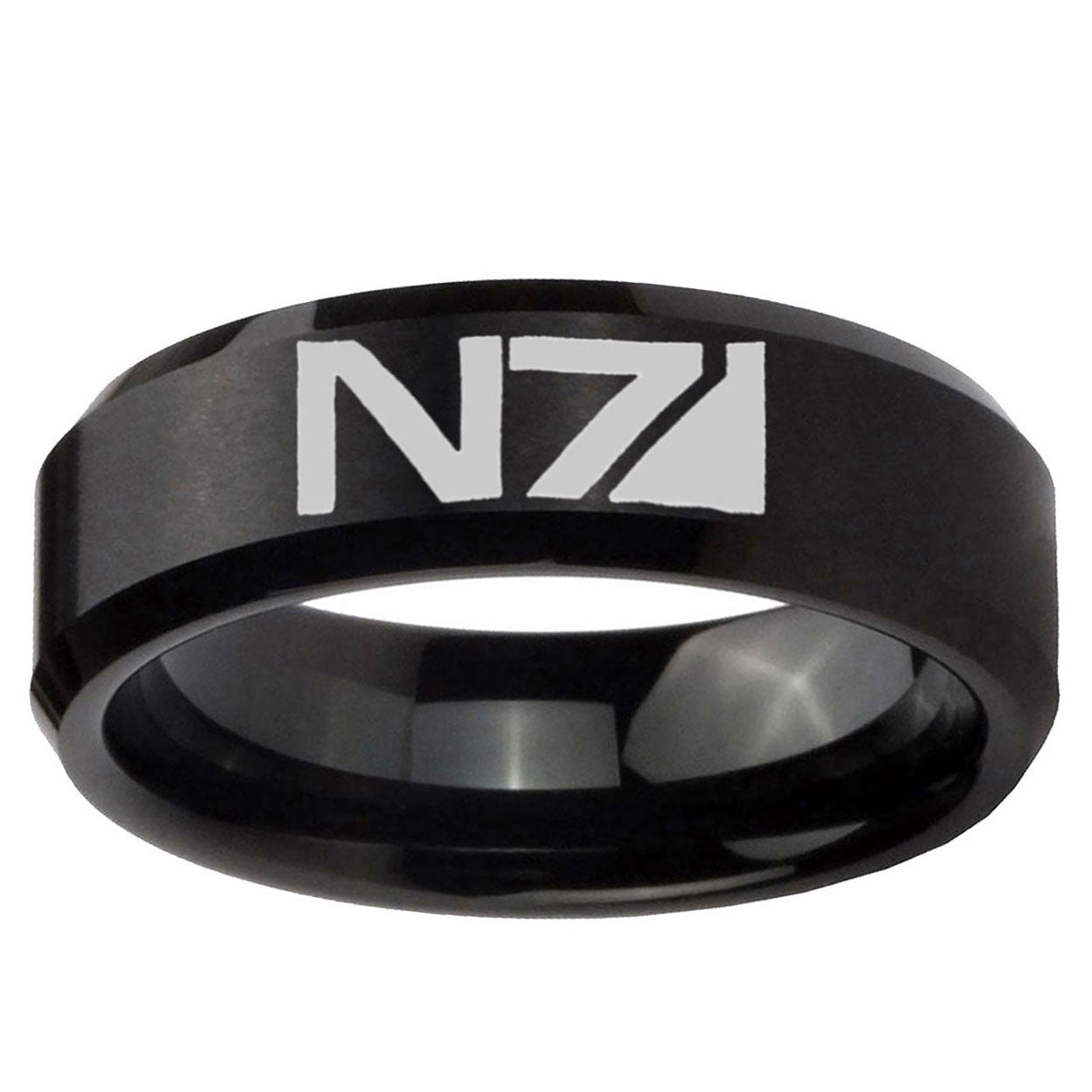 Intruding 5, 8mm N7 Design Beveled Edges Brush Black Tungsten Mens Engagement Ring . Offer in both 5mm and 8mm band width brushed black plated finished from size 4 to 14