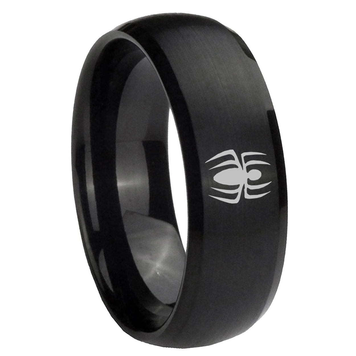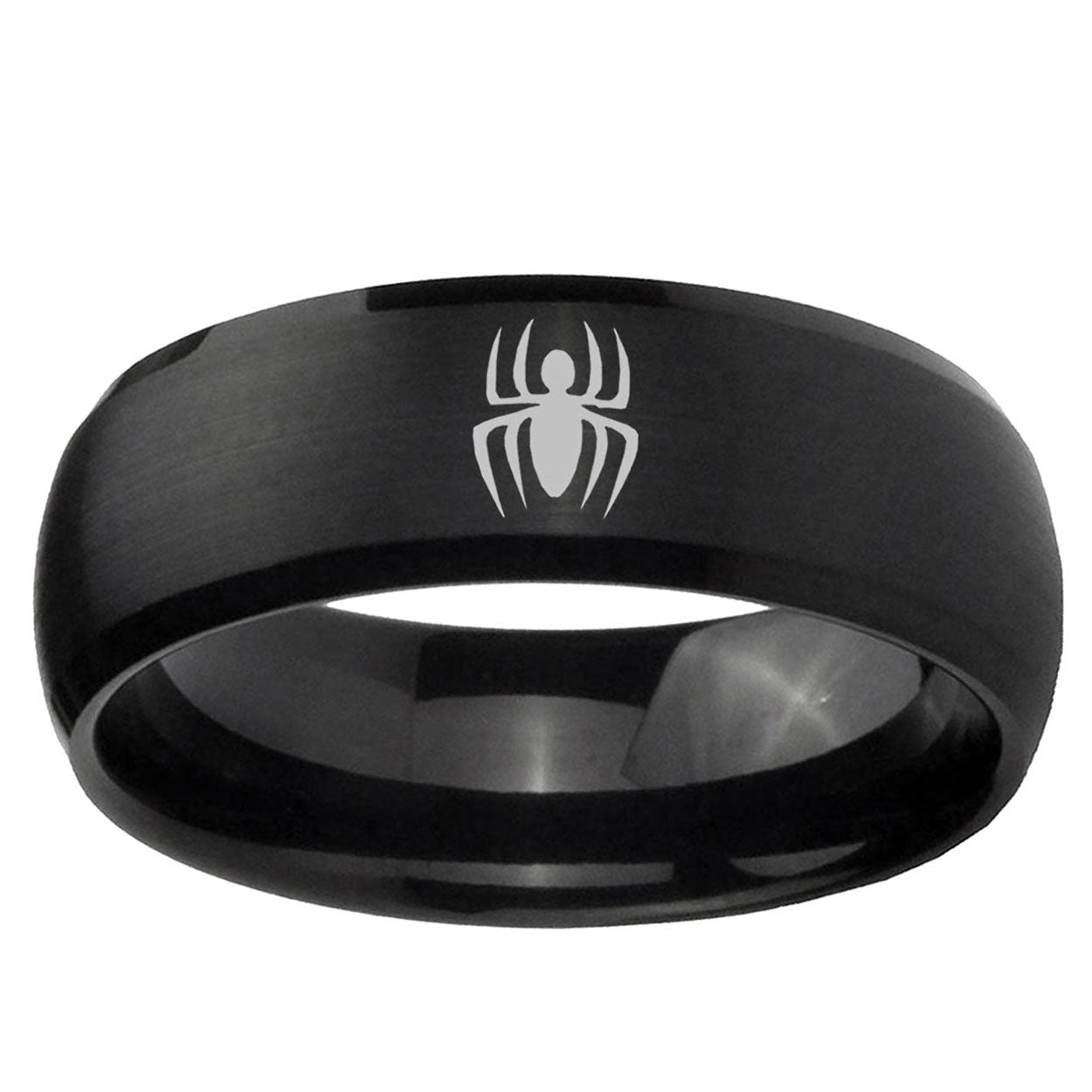 Intruding 5, 8mm Spiderman Dome Brush Black Tungsten Carbide Men's Wedding Ring . Offer in both 5mm and 8mm band width brush black plated finished from size 4 to 14