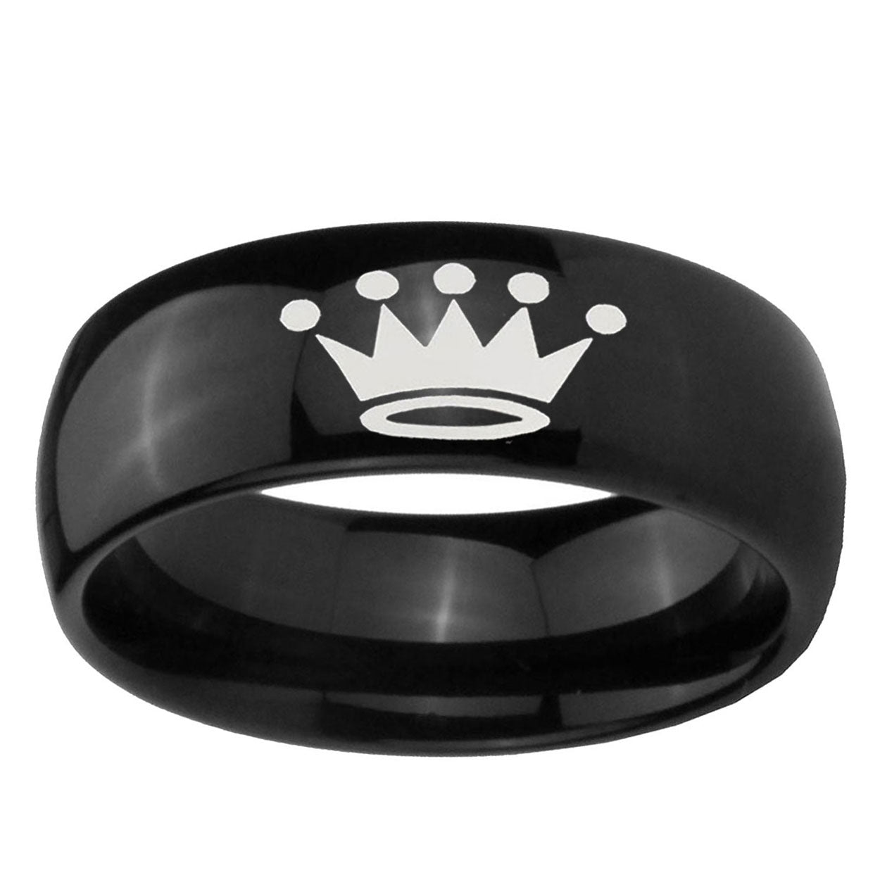 Intruding 5, 8mm Crown Dome Black Tungsten Carbide Mens Ring Engraved . Offer in both 5mm and 8mm band width polished black plated finished from size 4 to 14