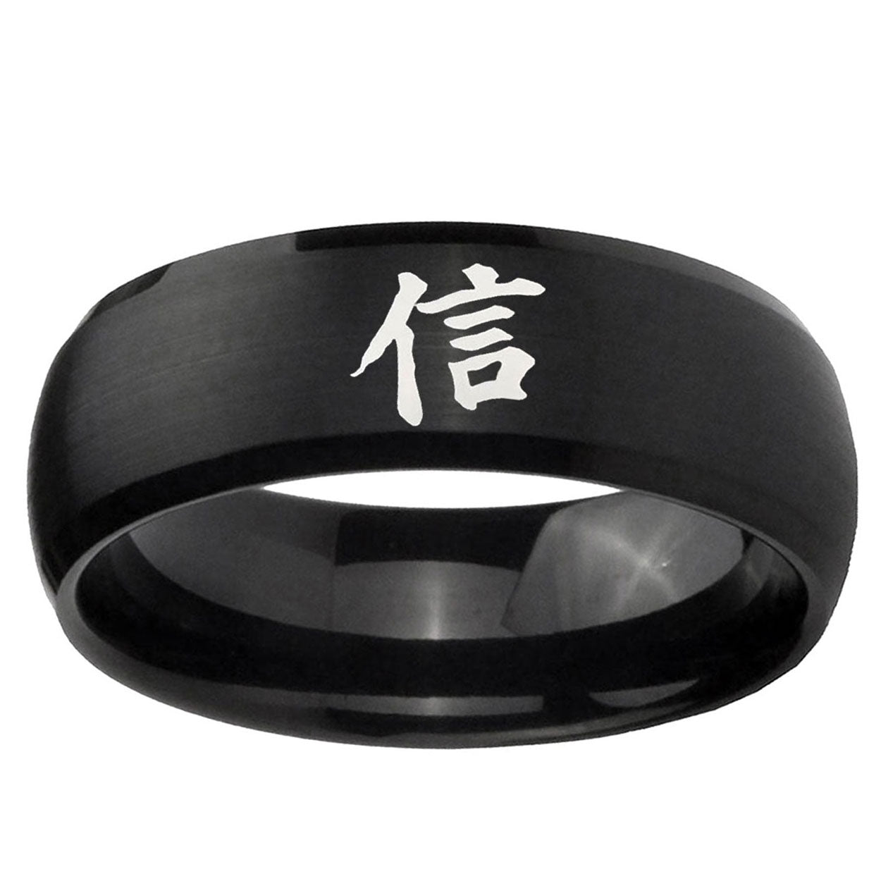 Personalize the 10mm Kanji Faith Dome Brush Black Tungsten Carbide Mens Ring Engraved. This brushed black dome ring with Kanji Faith design is perfect for custom engravings.