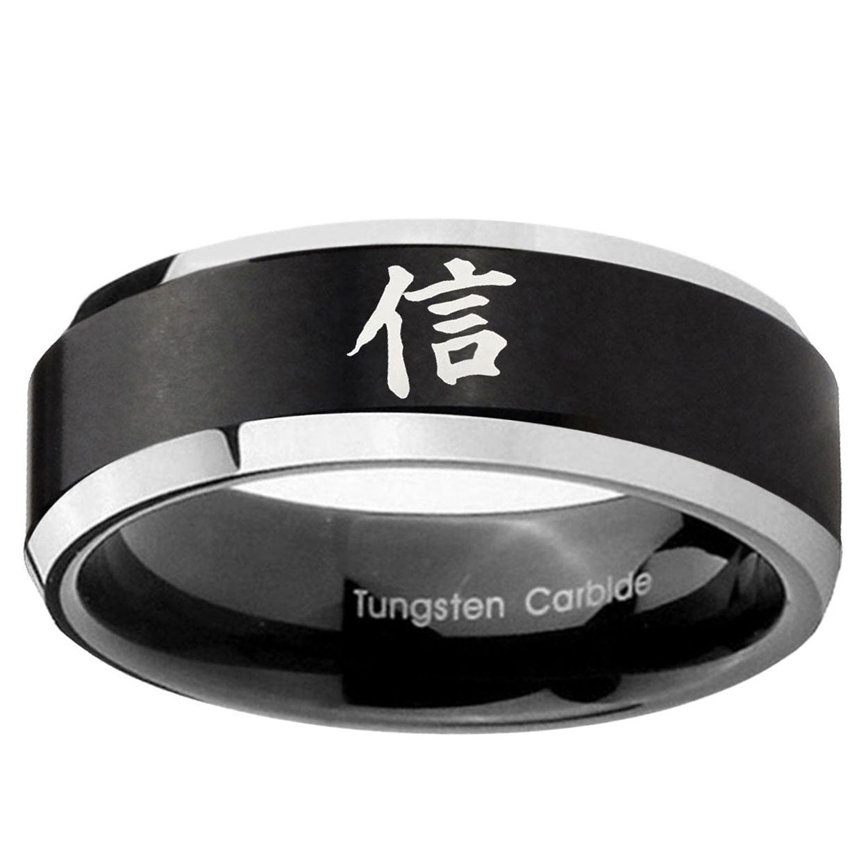 Celebrate milestones with the 10mm Kanji Faith Beveled Edges Brush Black 2 Tone Tungsten Anniversary Ring. This brushed black and 2-tone tungsten ring with Kanji Faith design is perfect for anniversaries.