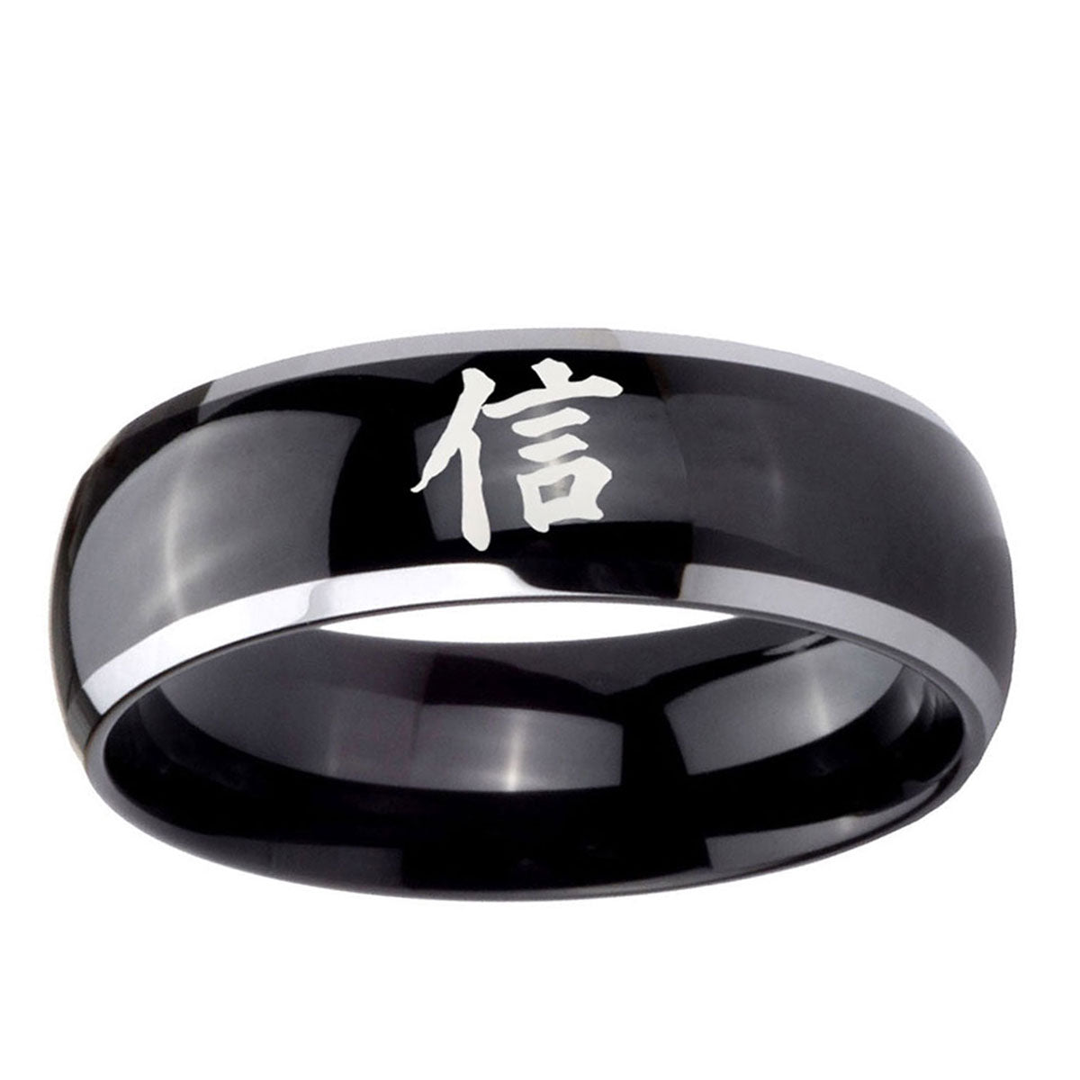Celebrate with the 10mm Kanji Faith Dome Glossy Black 2 Tone Tungsten Carbide Wedding Bands Ring. This glossy black and 2-tone dome ring with Kanji Faith design is perfect for weddings.