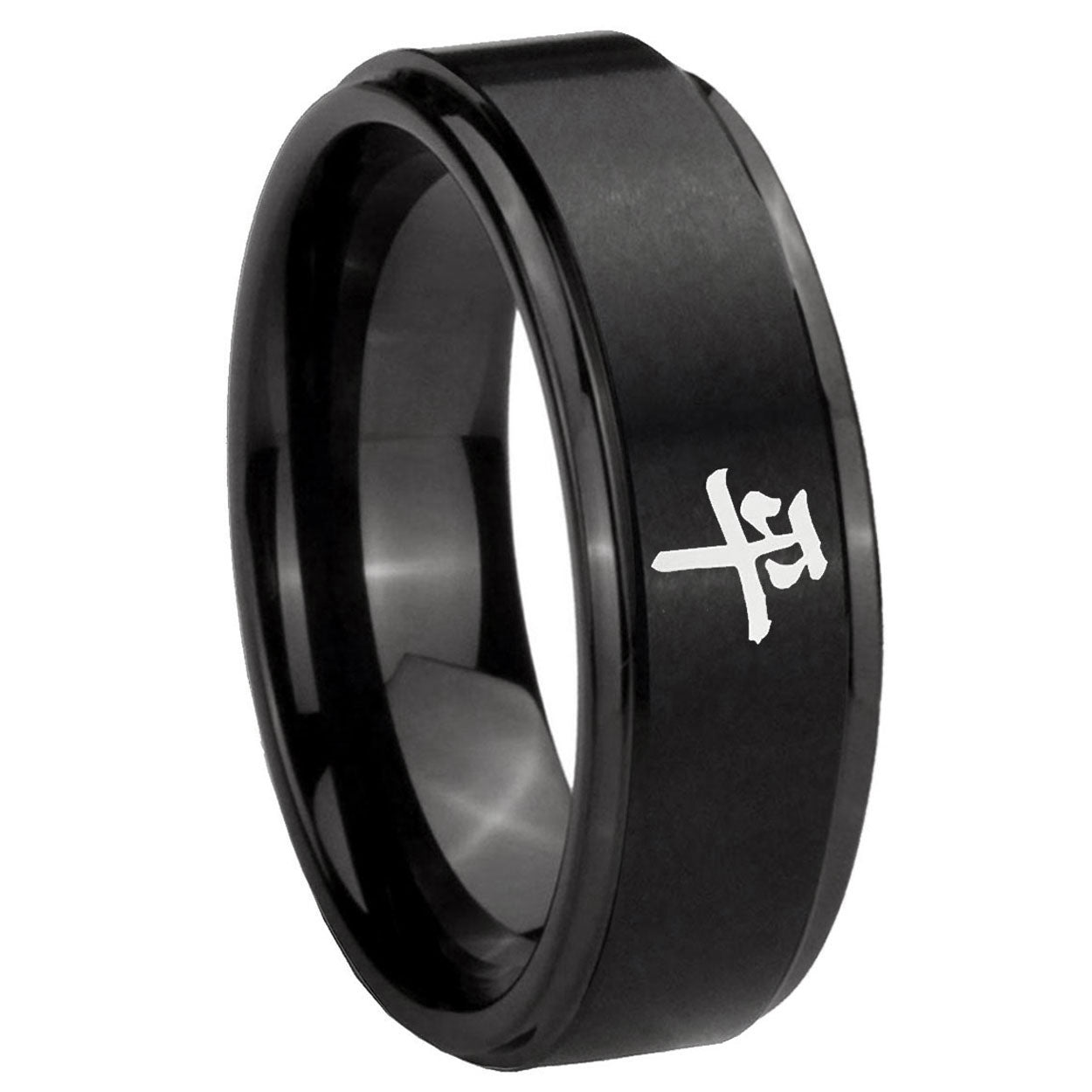 Propose with the 10mm Kanji Peace Step Edges Brush Black Tungsten Carbide Men's Engagement Band. This brushed black ring with step edges and Kanji Peace design is ideal for engagements.