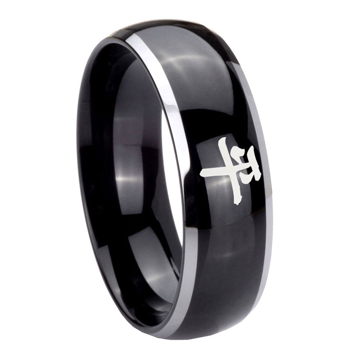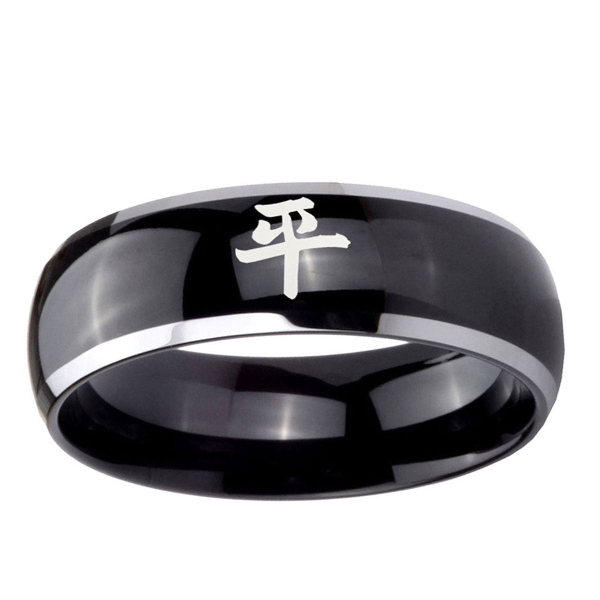 Intruding 5, 8mm Kanji Peace Dome Glossy Black 2 Tone Tungsten Carbide Men's Promise Rings . Offer in both 5mm and 8mm band width polished black plated two tone finished from size 4 to 14