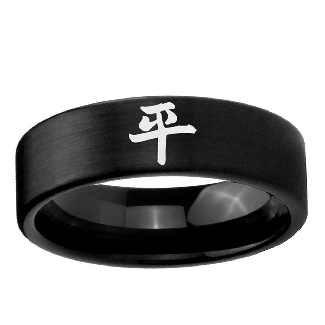 Intruding 6, 8mm Kanji Peace Pipe Cut Brush Black Tungsten Carbide Wedding Engraving Ring . Offer in both 6mm and 8mm band width brushed black plated finished from size 5 to 14