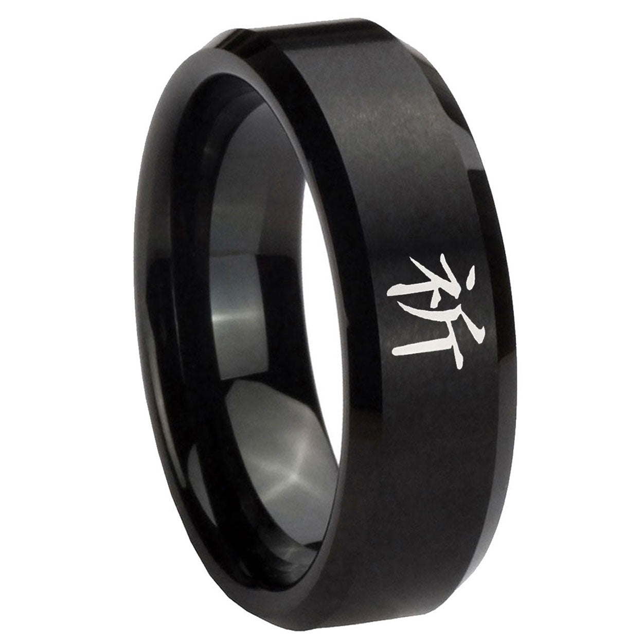 Celebrate with the 10mm Kanji Prayer Beveled Edges Brush Black Tungsten Carbide Wedding Bands Ring. This brushed black tungsten ring with Kanji Prayer design is perfect for weddings.