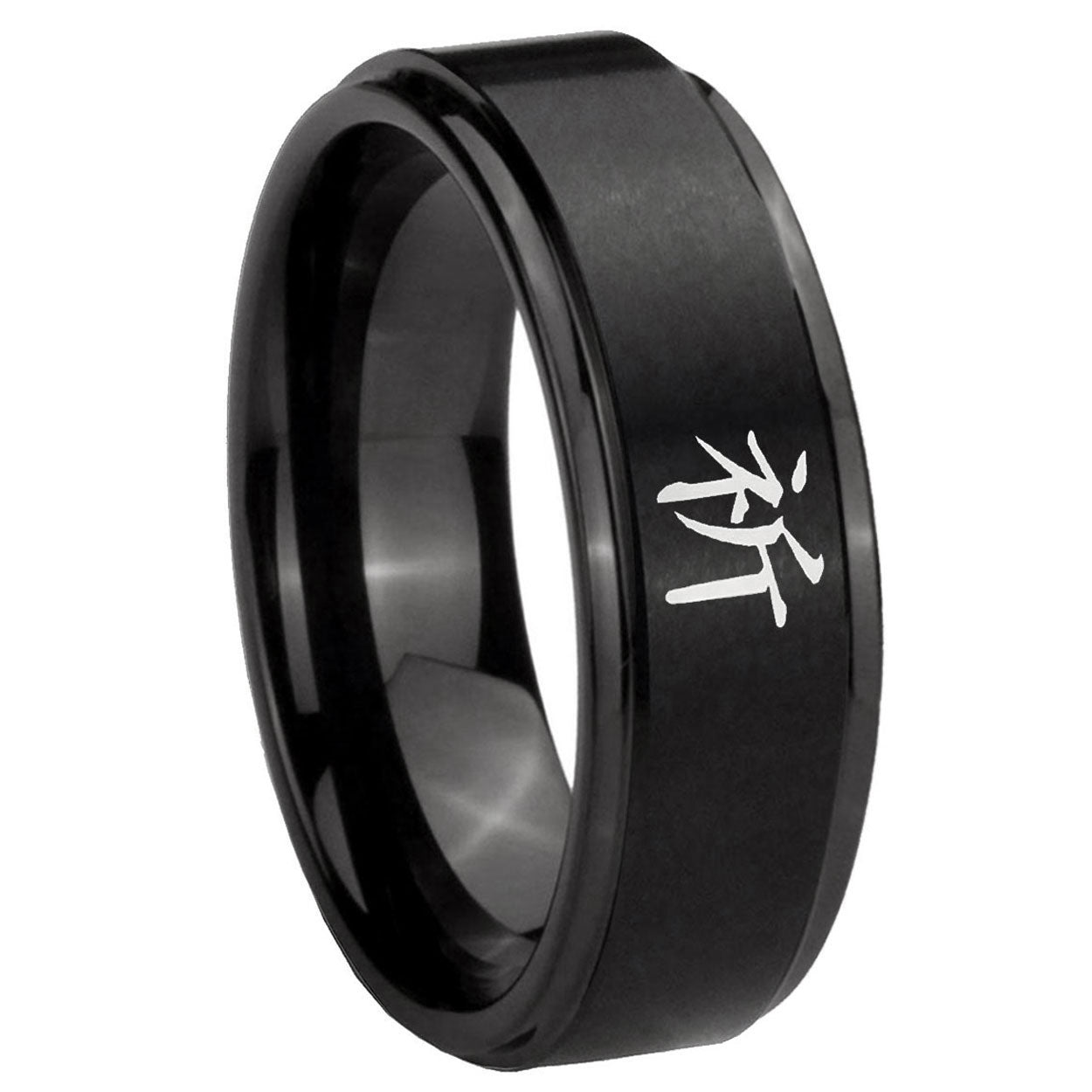 Propose with the 10mm Kanji Prayer Step Edges Brush Black Tungsten Carbide Mens Engagement Ring. This brushed black ring with step edges and Kanji Prayer design is ideal for engagements.