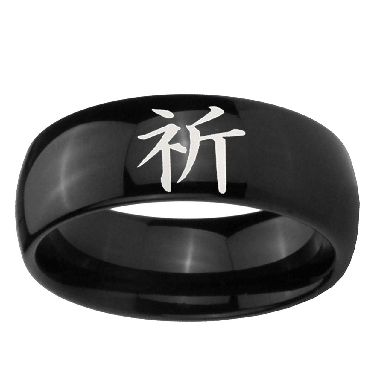Intruding 5, 8mm Kanji Prayer Dome Black Tungsten Carbide Wedding Engagement Ring . Offer in both 5mm and 8mm band width polished black plated finished from size 4 to 14