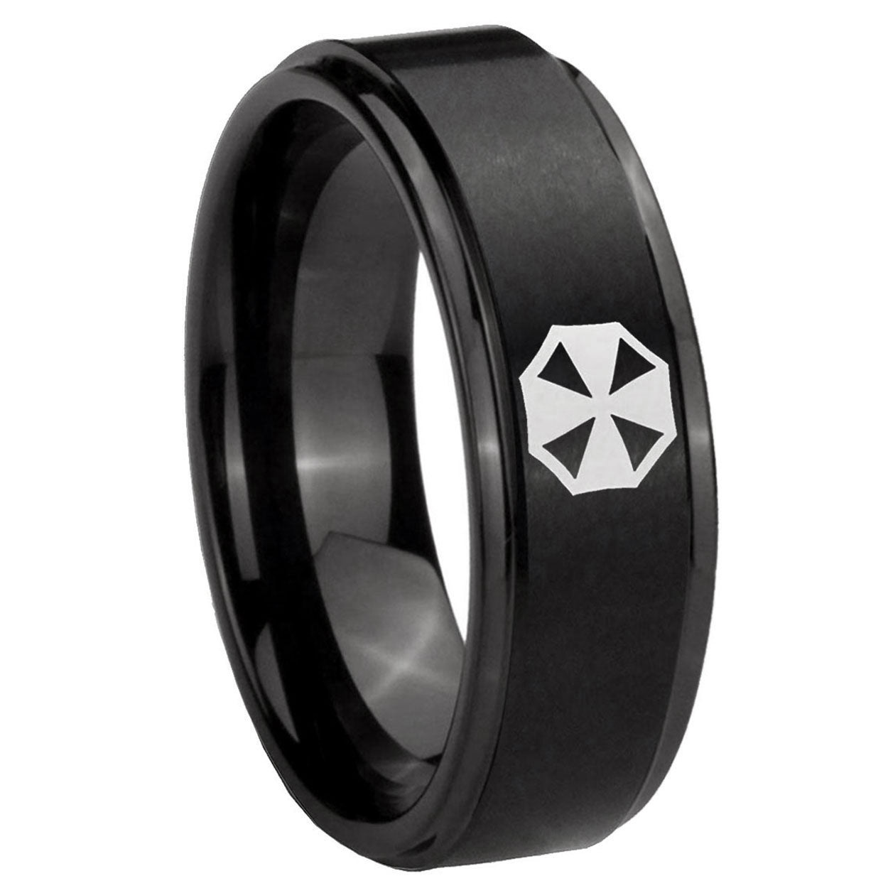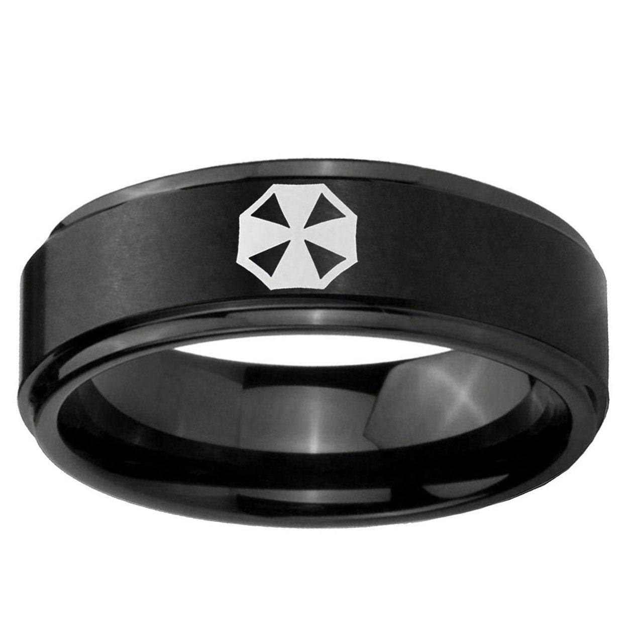 Intruding 5, 8mm Resident Evil Step Edges Brush Black Tungsten Carbide Mens Wedding Band . Offer in both 5mm and 8mm band width brush black plated finished from size 4 to 14