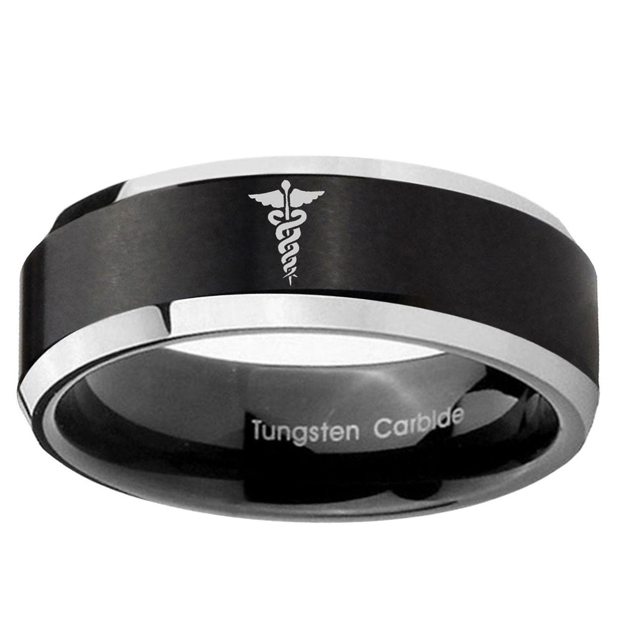Personalize the 10mm Medical Symbol Beveled Brush Black 2 Tone Tungsten Mens Ring Engraved. This brushed black and 2-tone tungsten ring with Medical Symbol design is perfect for custom engravings.