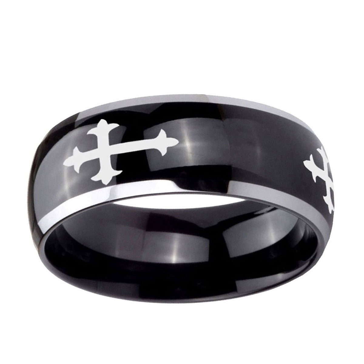Intruding 5, 8mm Christian Cross Religious Dome Glossy Black 2 Tone Tungsten Mens Wedding Ring . Offer in both 5mm and 8mm band width polished black plated two tone finished from size 4 to 14