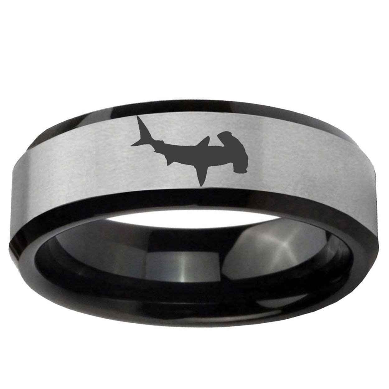 Intruding 5, 8mm Hammerhead Shark Beveled Brush Black 2 Tone Tungsten Men's Bands Ring . Offer in both 5mm and 8mm band width brush black 2 tone finished from size 4 to 14