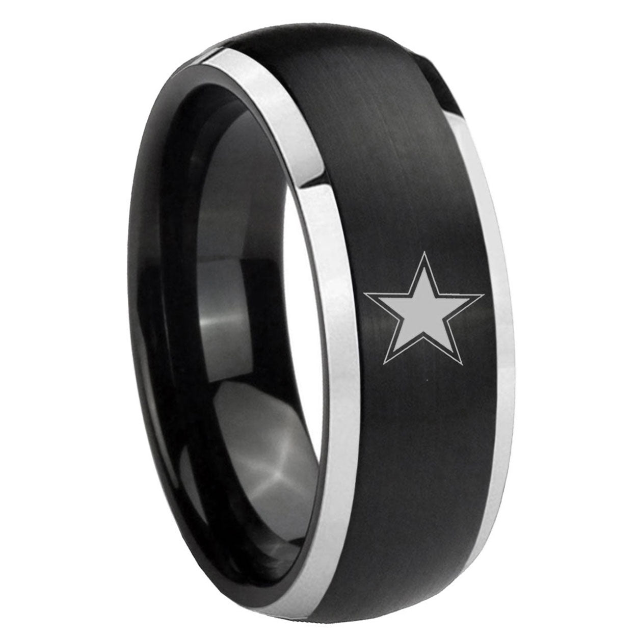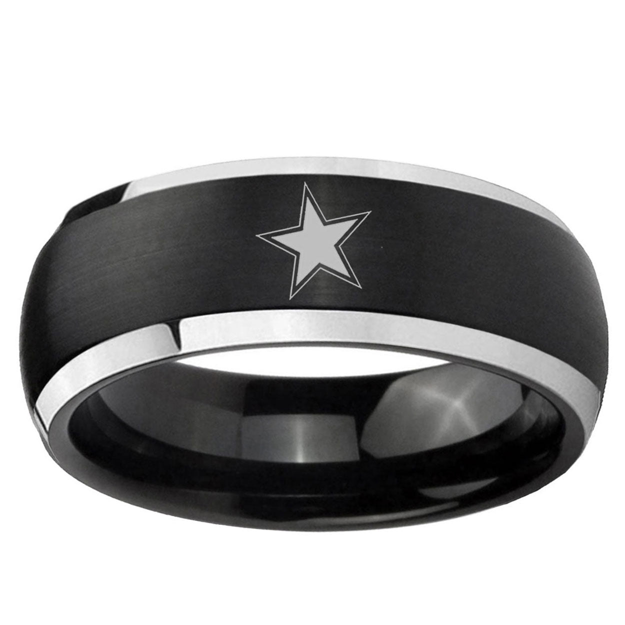 Intruding 5, 8mm Cowboys Star Dome Brushed Black 2 Tone Tungsten Personalized Ring . Offer in both 5mm and 8mm band width brushed black plated finished from size 4 to 14