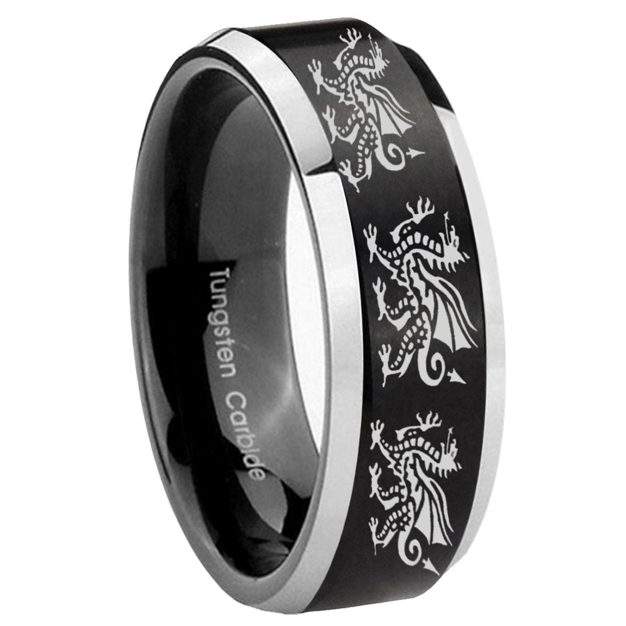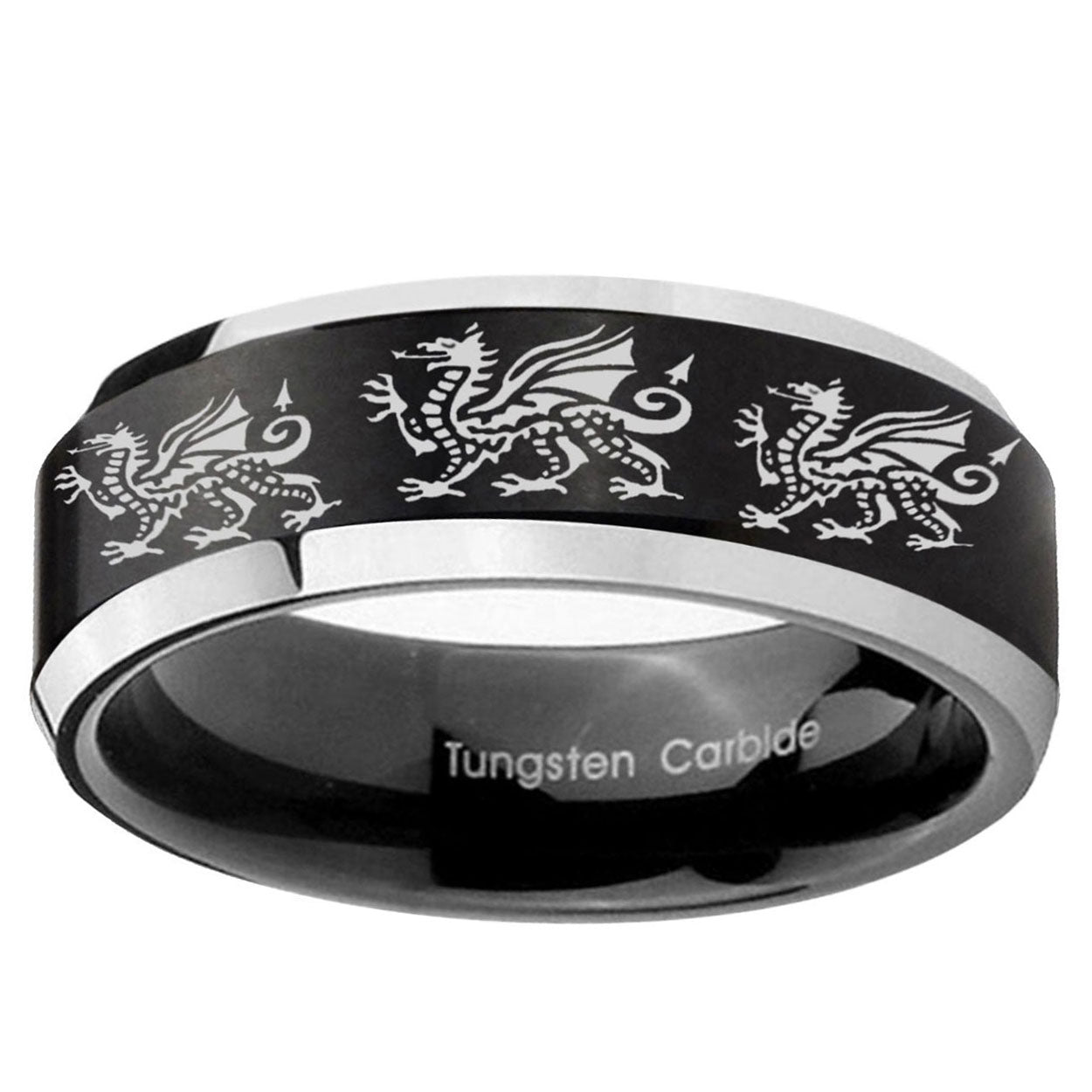 Celebrate with the 10mm Multiple Dragon Beveled Brush Black 2 Tone Tungsten Men's Wedding Band. This brushed black and 2-tone tungsten ring with Multiple Dragon design is perfect for weddings.