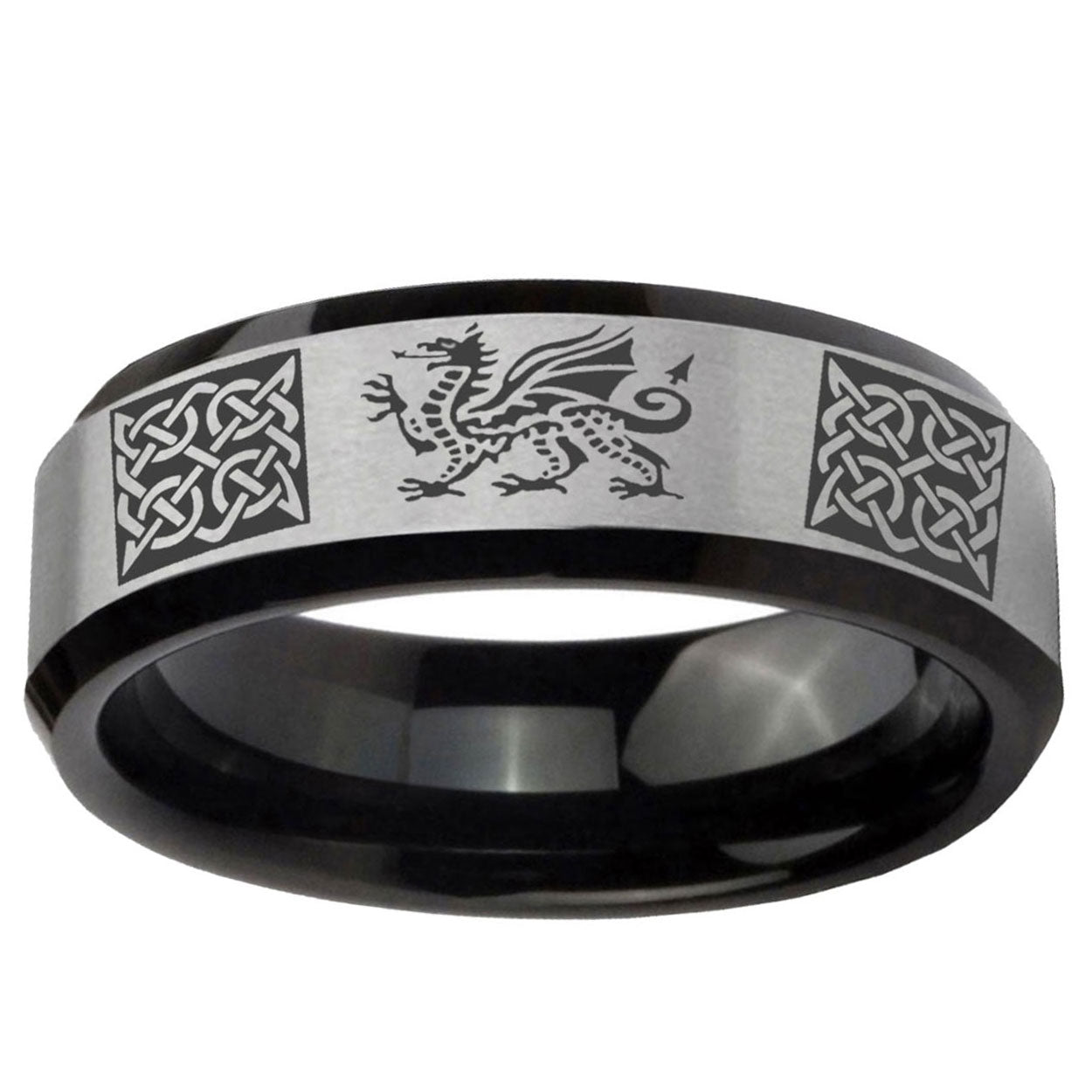 Intruding 5, 8mm Multiple Dragon Celtic Beveled Brush Black 2 Tone Tungsten Mens Bands Ring . Offer in both 5mm and 8mm band width brush black 2 tone finished from size 4 to 14