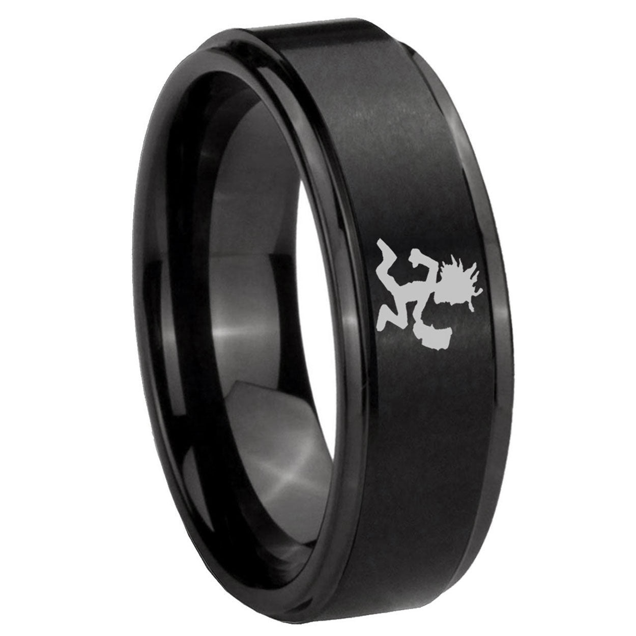 Intruding 5, 8mm Hatchet Man Step Edges Brush Black Tungsten Carbide Anniversary Ring . Offer in both 5mm and 8mm band width brush black plated finished from size 4 to 14