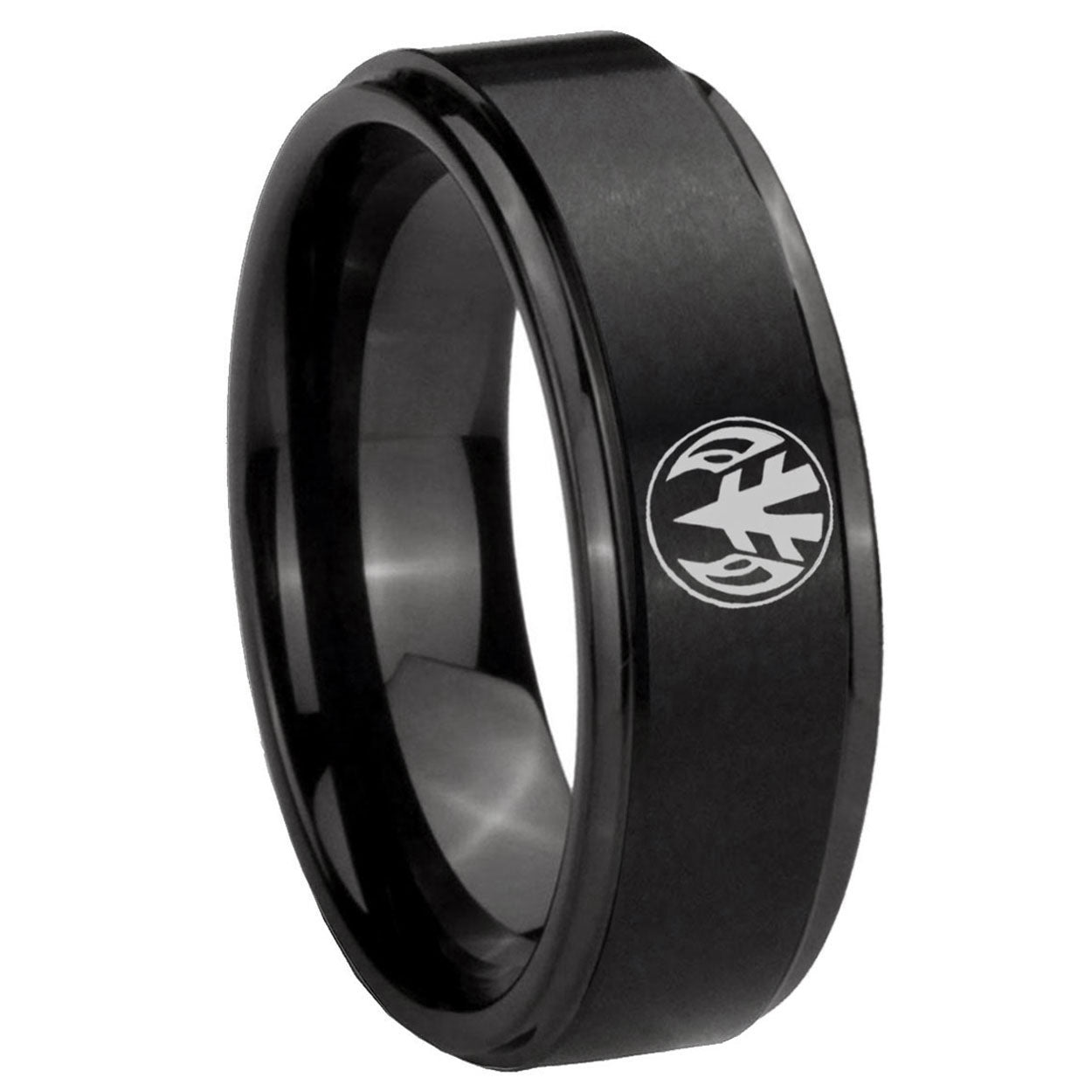 Style the 10mm Love Power Rangers Step Edges Brush Black Tungsten Men's Bands Ring. This brushed black ring with step edges and Love Power Rangers design is perfect for men.