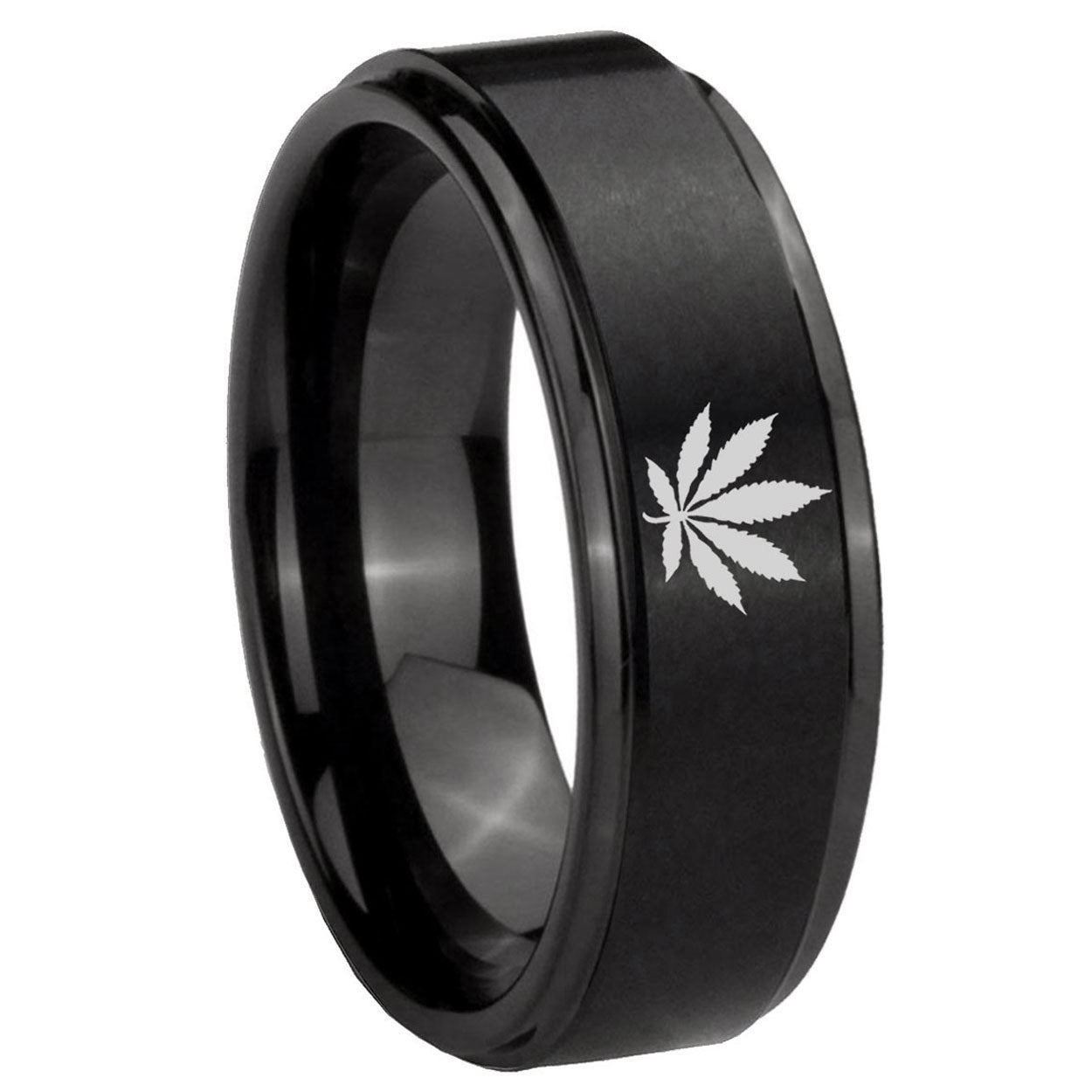 Intruding 5, 8mm Marijuana Leaf Step Edges Brush Black Tungsten Carbide Men's Bands Ring . Offer in both 5mm and 8mm band width brush black plated finished from size 4 to 14
