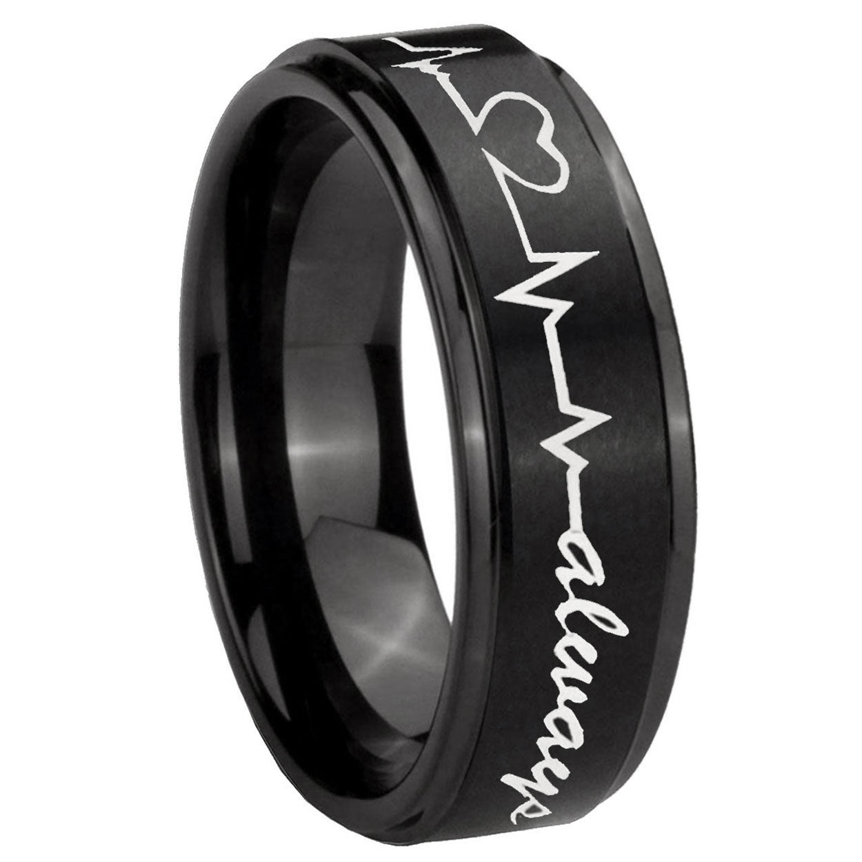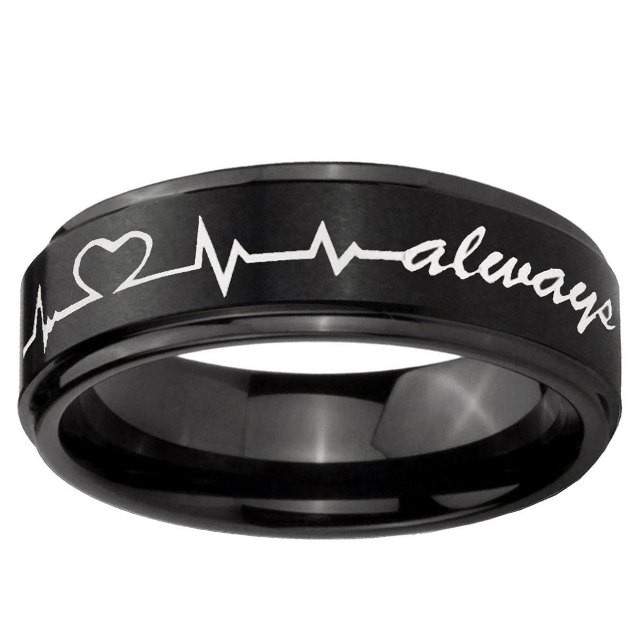 Style the 10mm Heart Beat forever Heart always Step Edges Brush Black Tungsten Bands Ring. This brushed black ring with step edges and Heart Beat design is perfect for men.