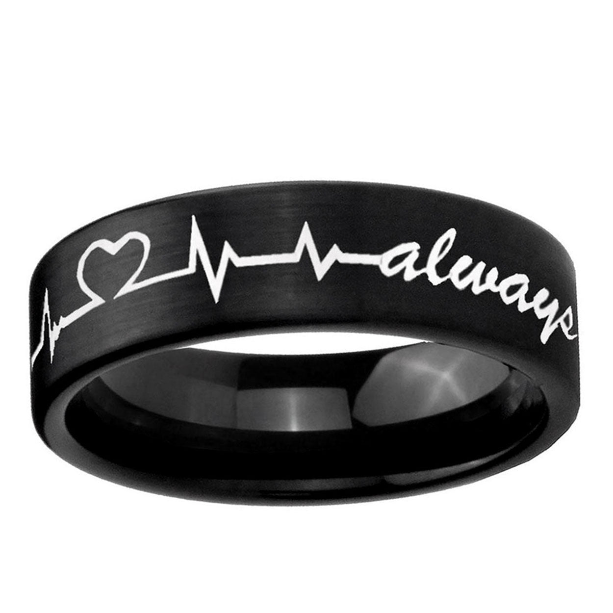 6, 8mm Heart Beat forever Heart always Pipe Cut Brush Black Tungsten Men's Ring