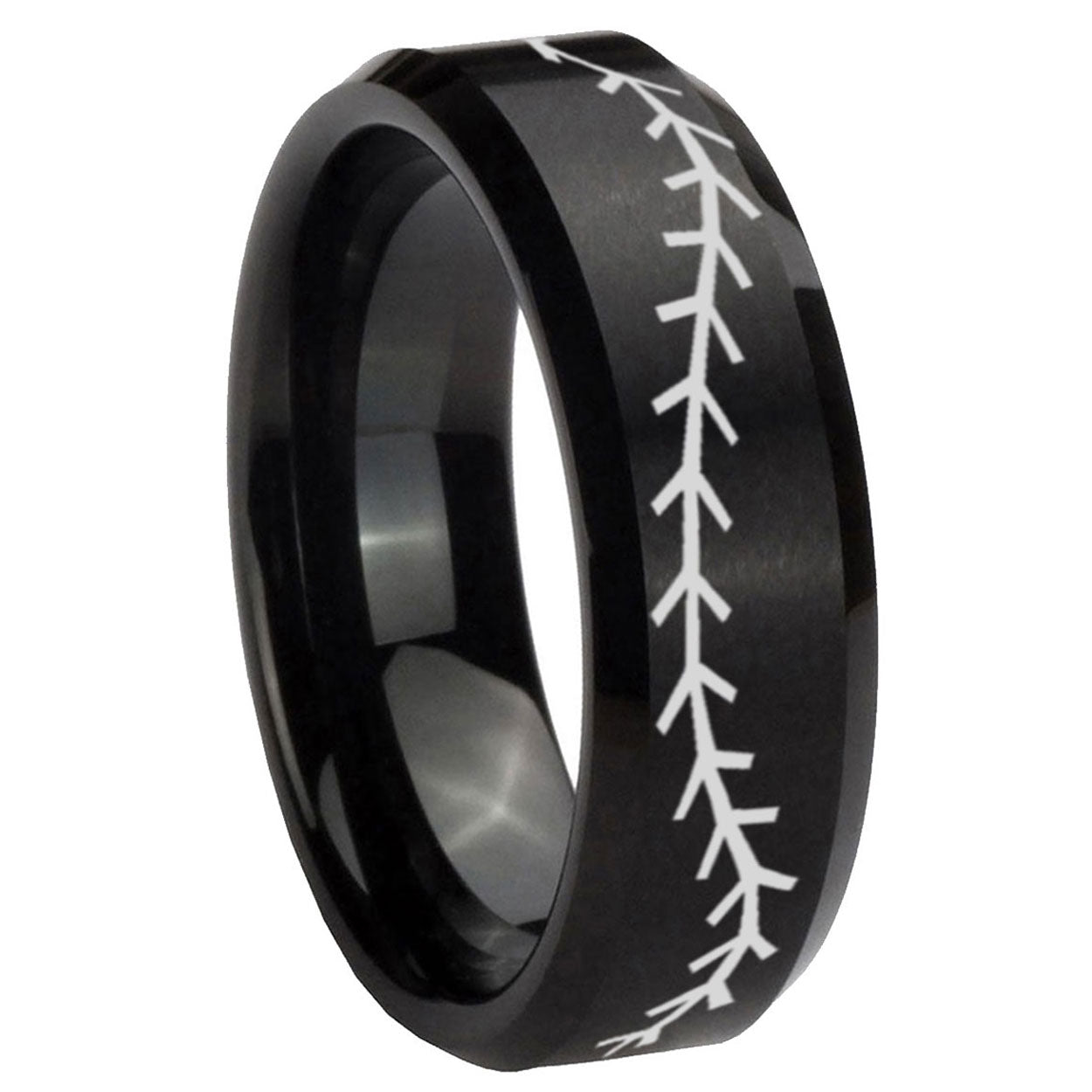 Celebrate with the 10mm Baseball Stitch Beveled Edges Brush Black Tungsten Carbide Men's Band Ring. This brushed black tungsten ring with baseball stitch design is perfect for men.
