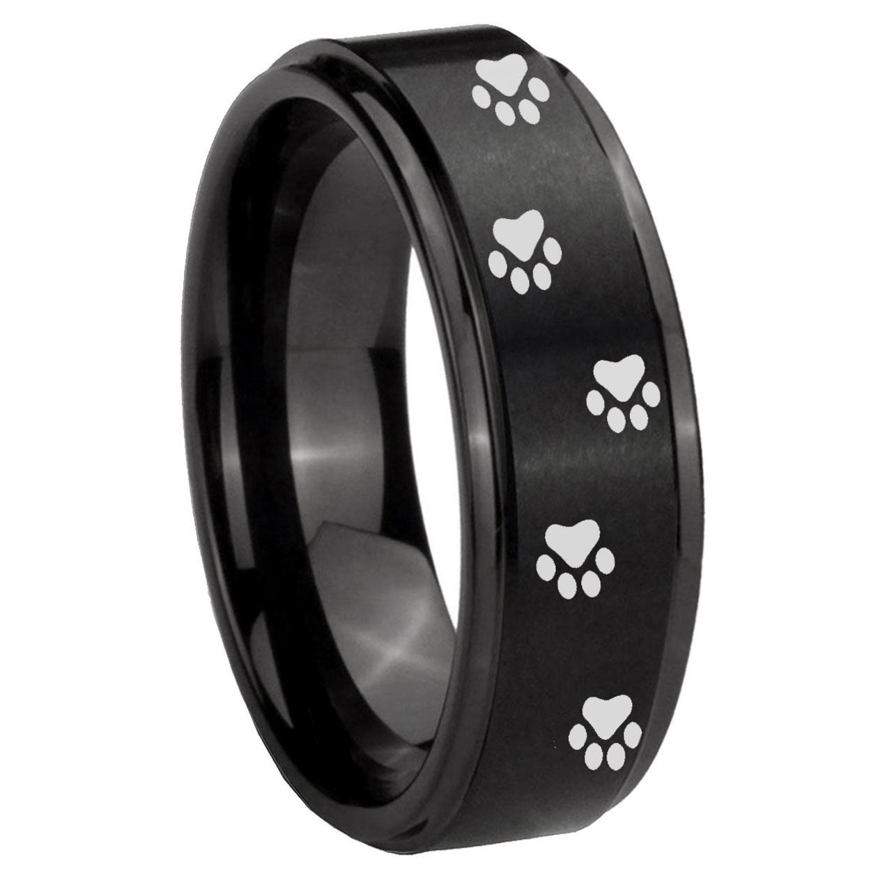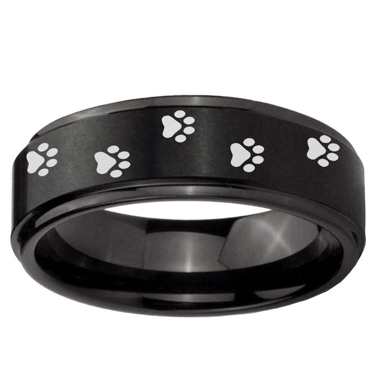 Intruding 5, 8mm Paw Print Step Edges Brush Black Tungsten Carbide Promise Ring . Offer in both 5mm and 8mm band width brush black plated finished from size 4 to 14
