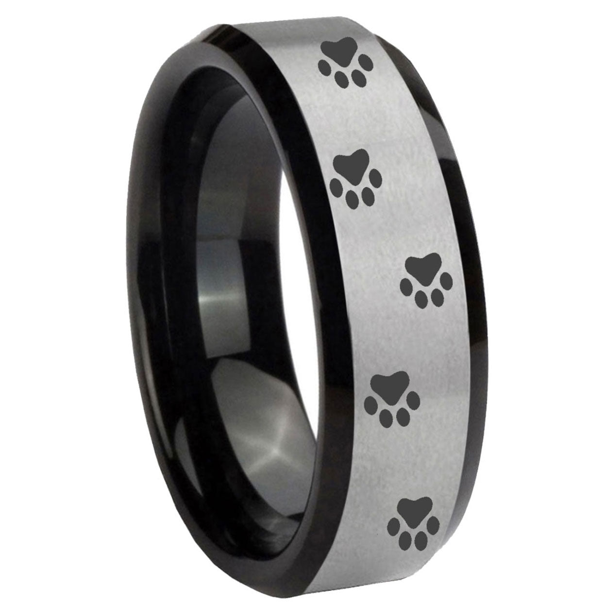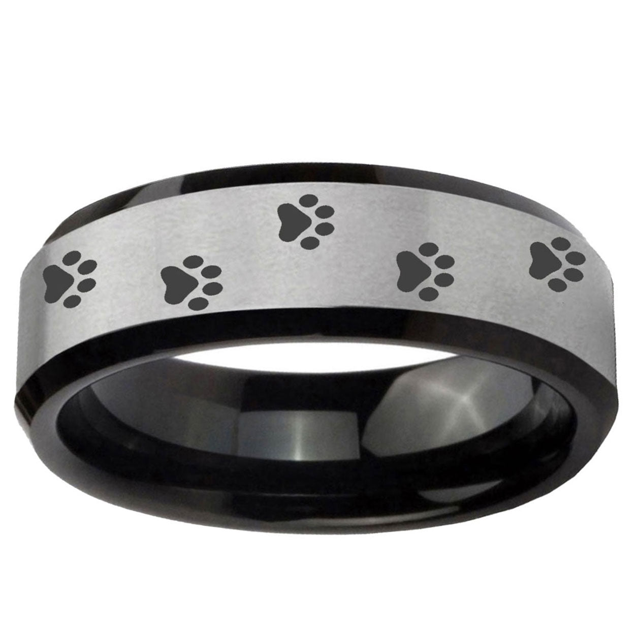 10mm Paw Print Beveled Edges Brushed Silver Black Tungsten Carbide Promise Ring