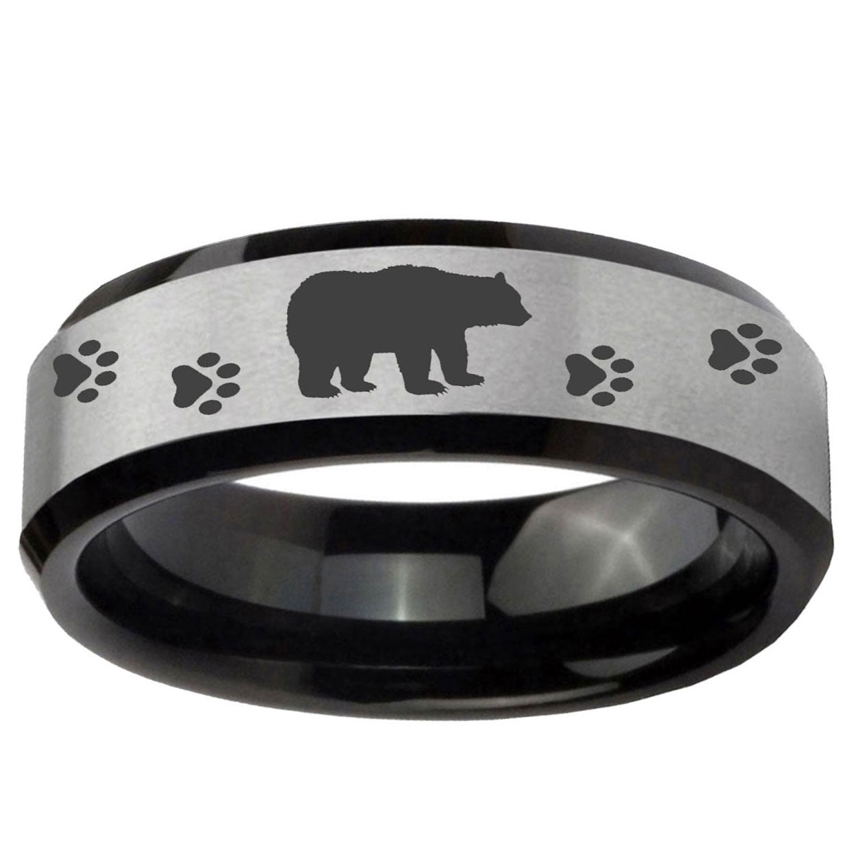5, 8mm Bear and Paw Beveled Edges Brush Black 2 Tone Tungsten Men's Promise Rings