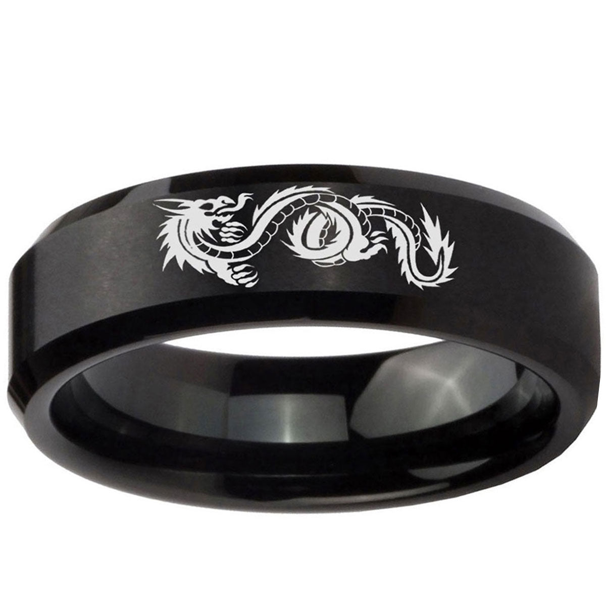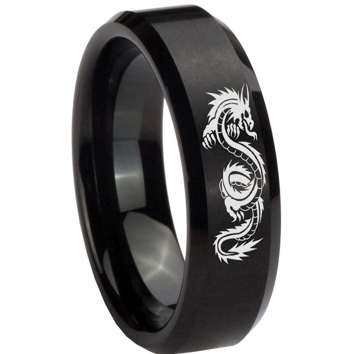 Intruding 5, 8mm Dragon Beveled Edges Brush Black Tungsten Carbide Men's Wedding Ring . Offer in both 5mm and 8mm band width brushed black plated finished from size 4 to 14