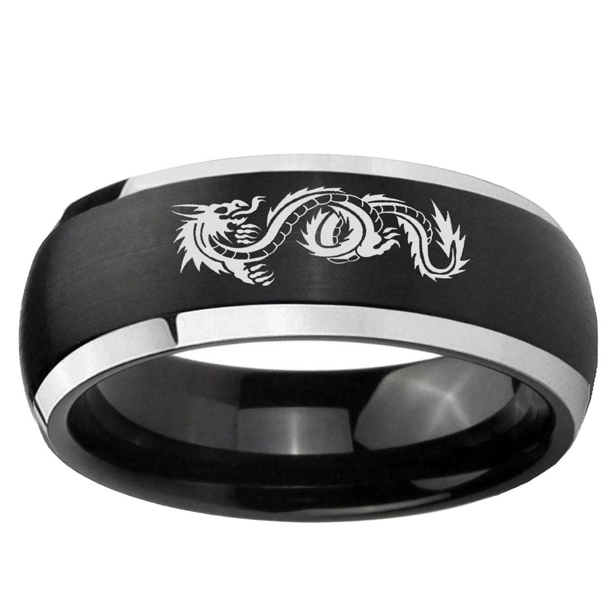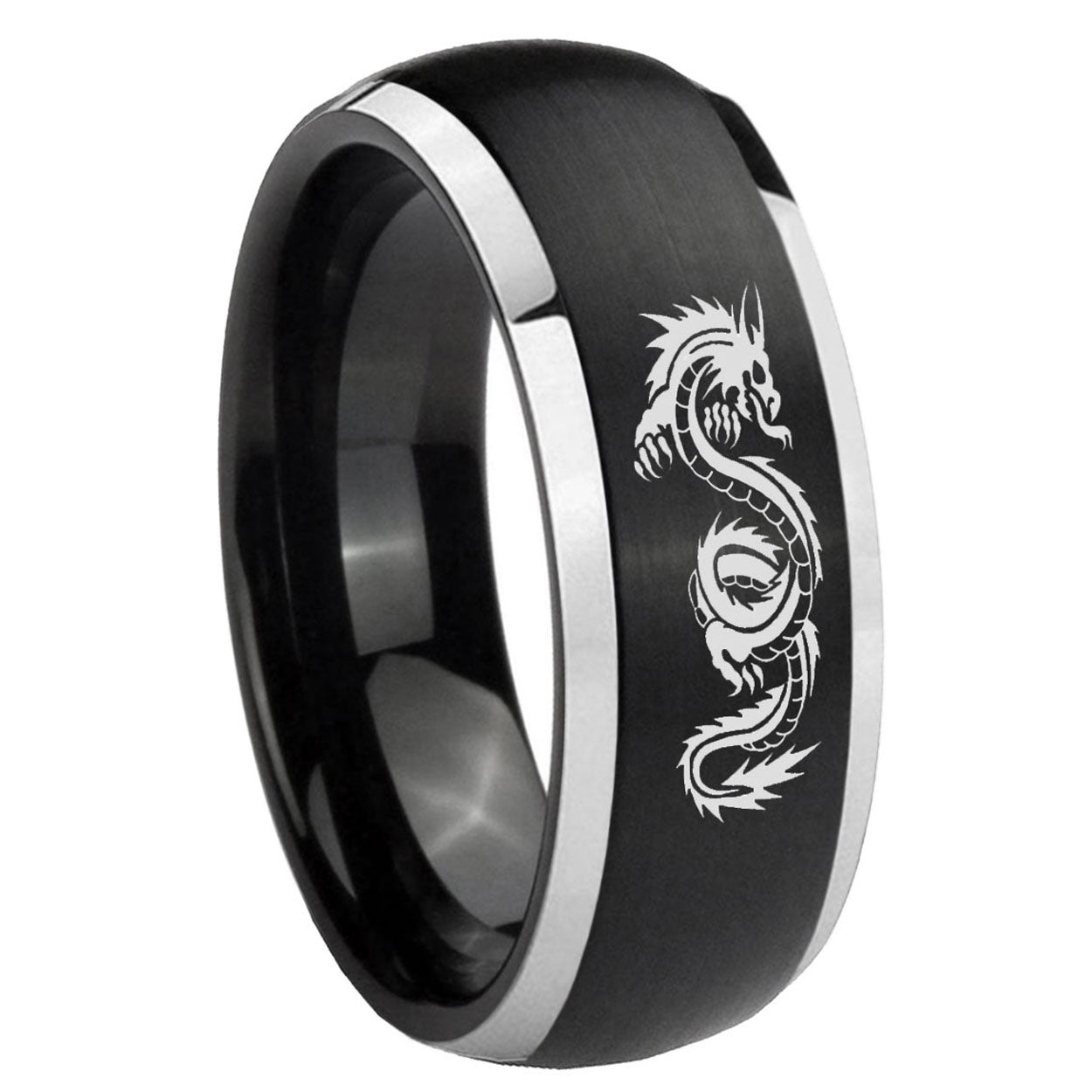 Intruding 5, 8mm Dragon Dome Brushed Black 2 Tone Tungsten Carbide Men's Engagement Ring . Offer in both 5mm and 8mm band width brushed black plated finished from size 4 to 14