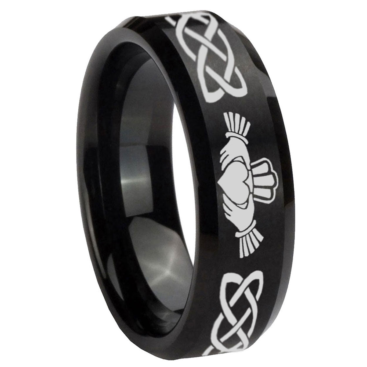 10mm Irish Claddagh Beveled Edges Brush Black Tungsten Carbide Mens Ring Engraved