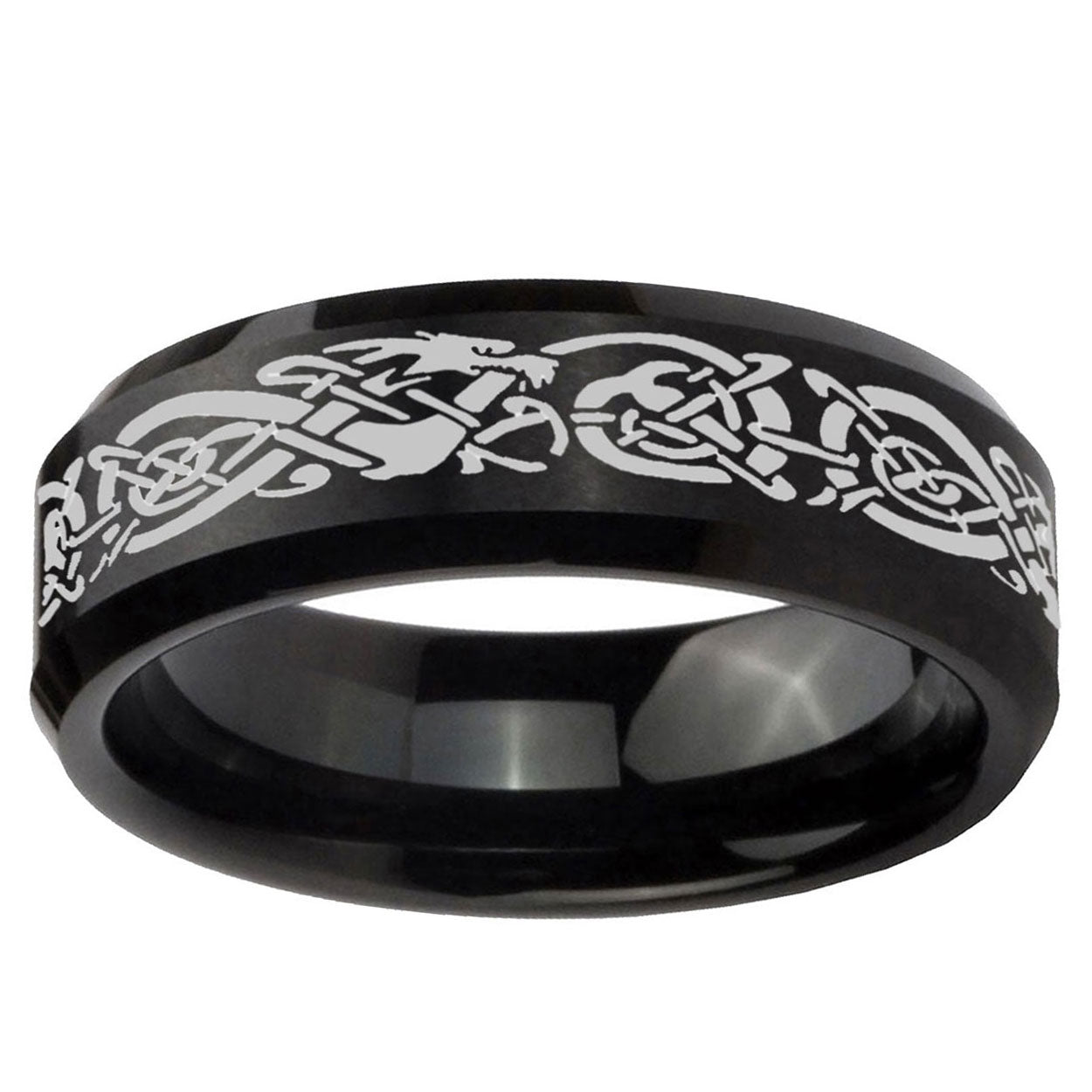 Celebrate with the 10mm Celtic Knot Dragon Beveled Edges Brush Black Tungsten Wedding Band Ring. This brushed black tungsten ring with Celtic knot dragon design is perfect for weddings.
