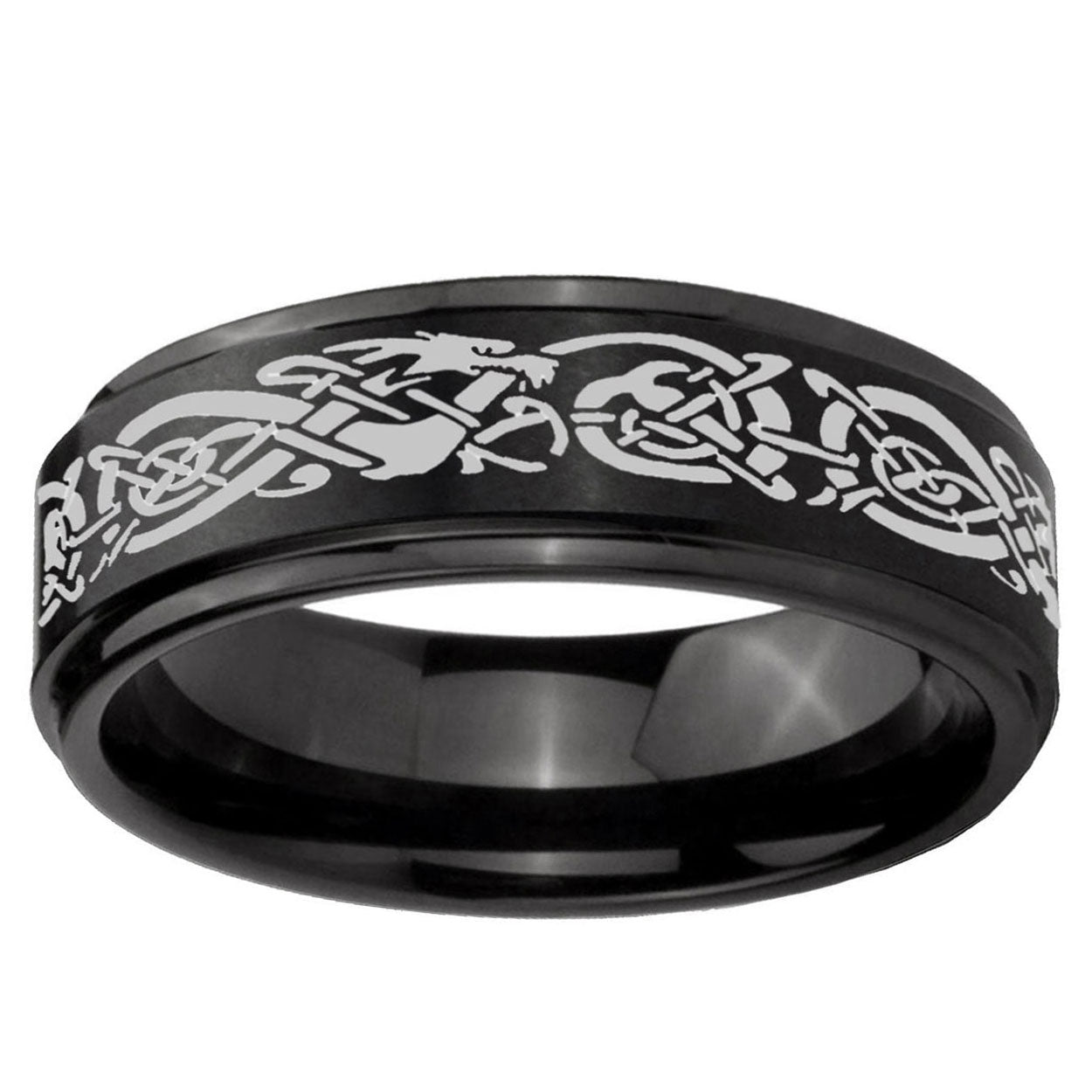 Intruding 5, 8mm Celtic Knot Dragon Step Edges Brush Black Tungsten Carbide Promise Ring . Offer in both 5mm and 8mm band width brush black plated finished from size 4 to 14