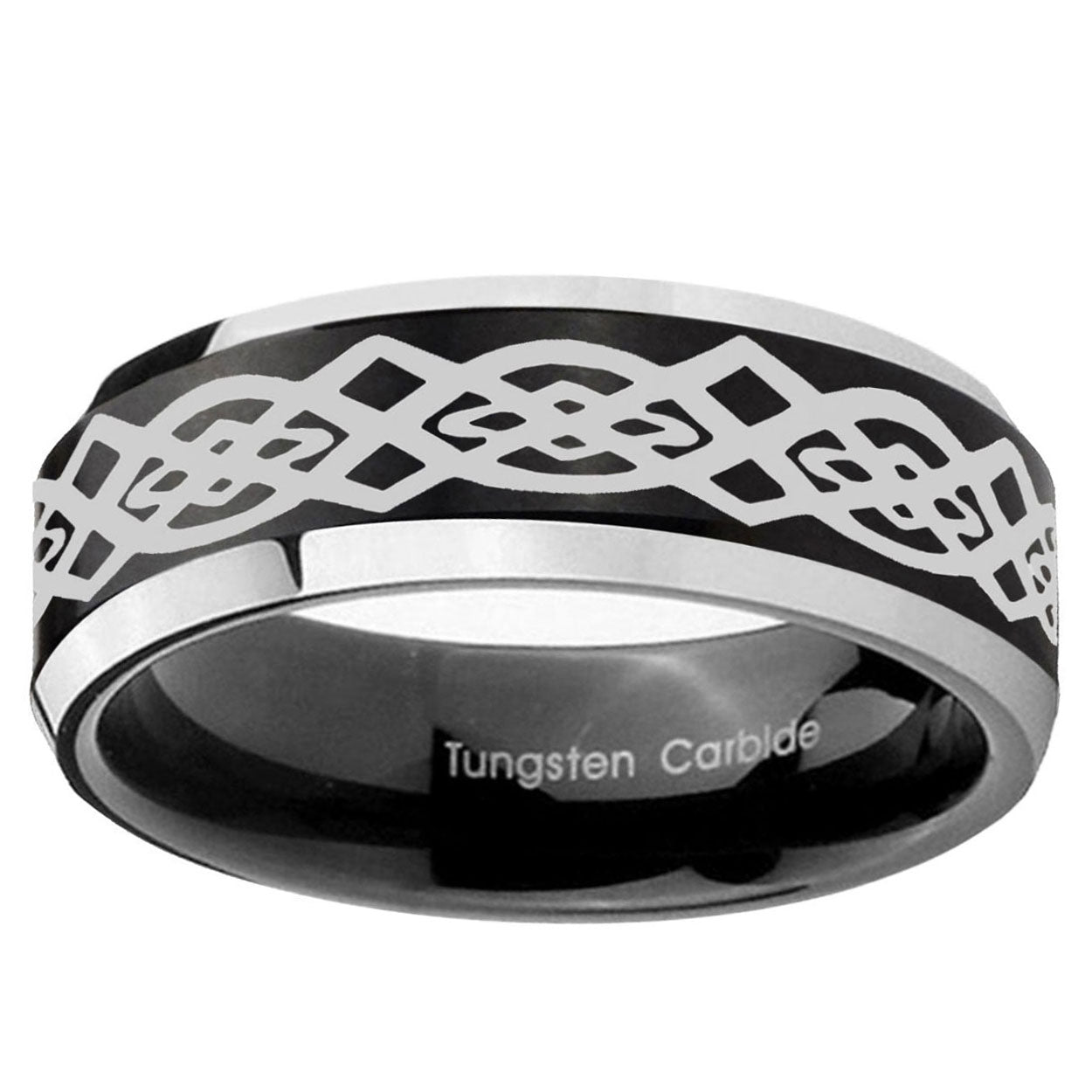 Intruding 5, 8mm Celtic Knot Beveled Edges Brush Black 2 Tone Tungsten Carbide Bands Ring . Offer in both 5mm and 8mm band width brushed black plated 2 tone finished from size 4 to 14