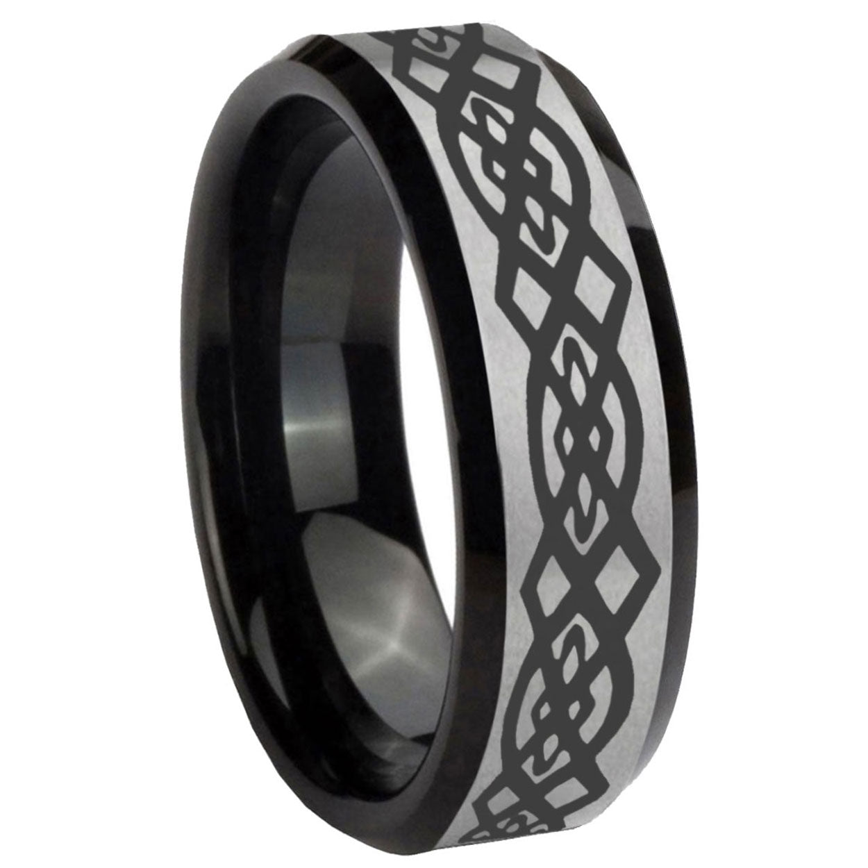 Intruding 5, 8mm Celtic Knot Beveled Edges Brush Black 2 Tone Tungsten Carbide Mens Ring . Offer in both 5mm and 8mm band width brush black 2 tone finished from size 4 to 14