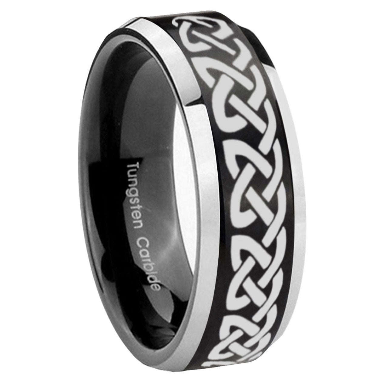 Intruding 5, 8mm Celtic Knot Love Beveled Edges Brush Black 2 Tone Tungsten Rings for Men . Offer in both 5mm and 8mm band width brushed black plated 2 tone finished from size 4 to 14