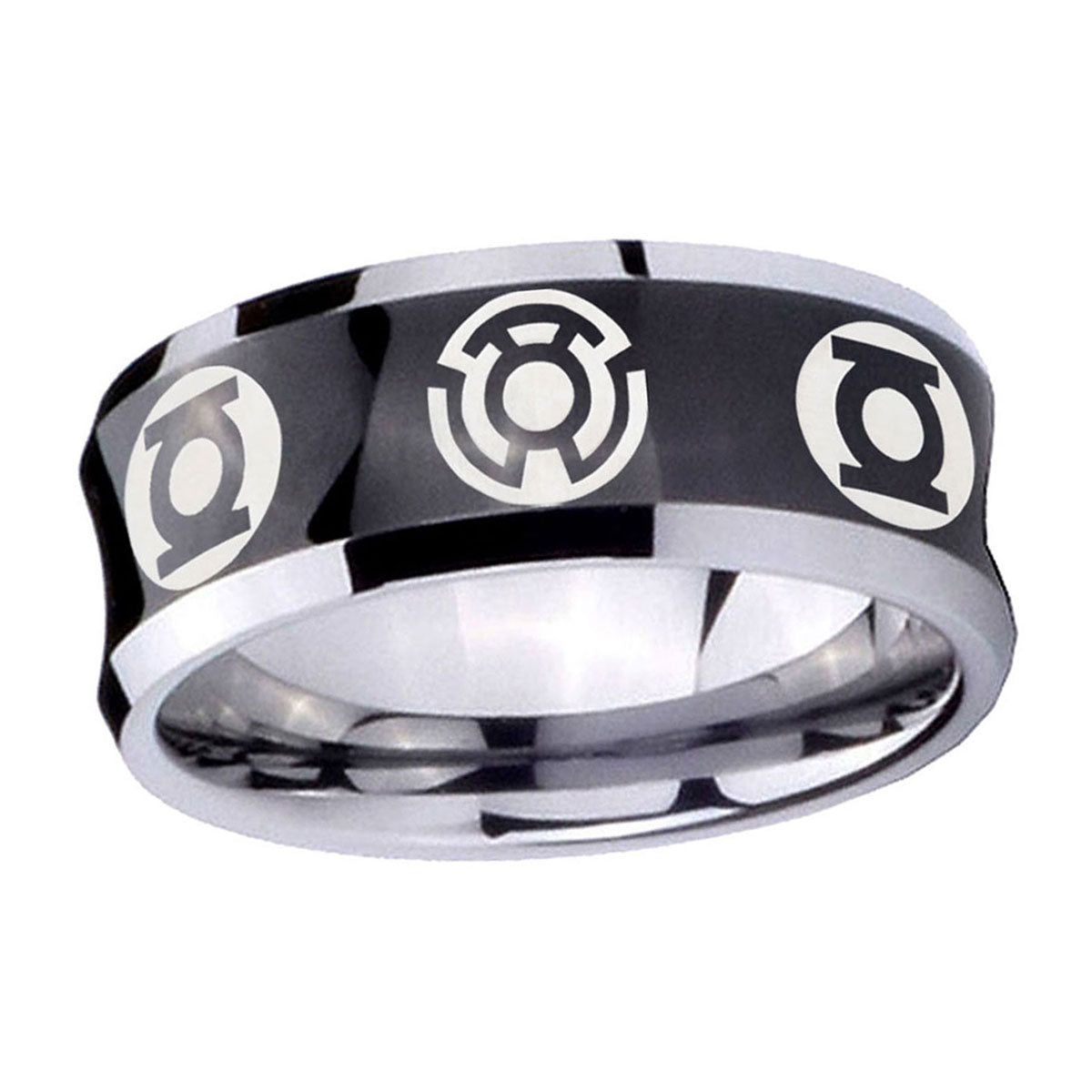 Introuding 5, 8mm Blue Green Lantern Concave Black Mens Tungsten Wedding Ring . Offer in both 5mm and 8mm band width black plated two tone finished from size 4 to 14