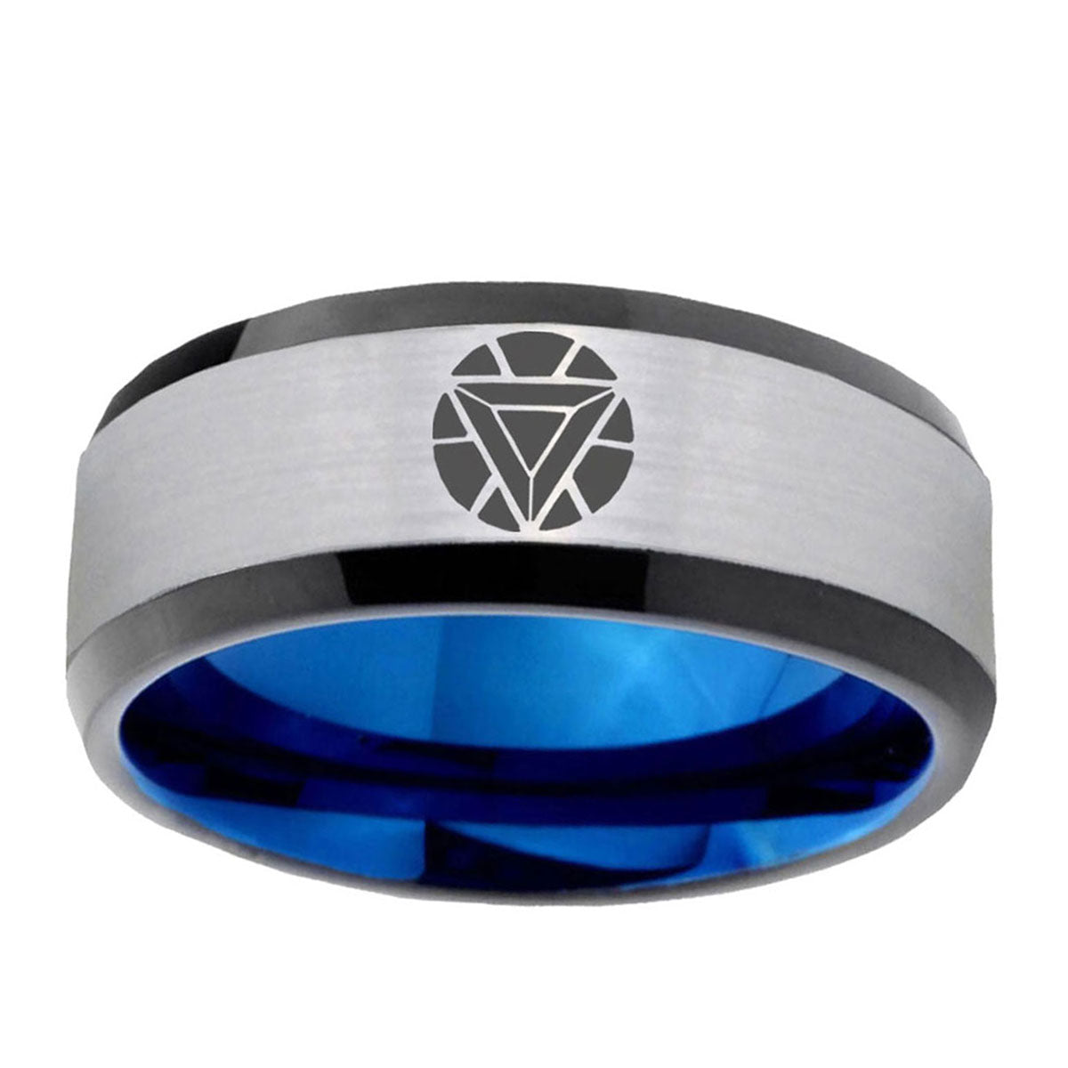 Introuding 6, 8mm Iron Man Art Reactor Beveled Edge Blue Silver Tungsten Wedding Rings For Men . Offer in both 5mm and 8mm band width silver and blue plated finished from size 4 to 14