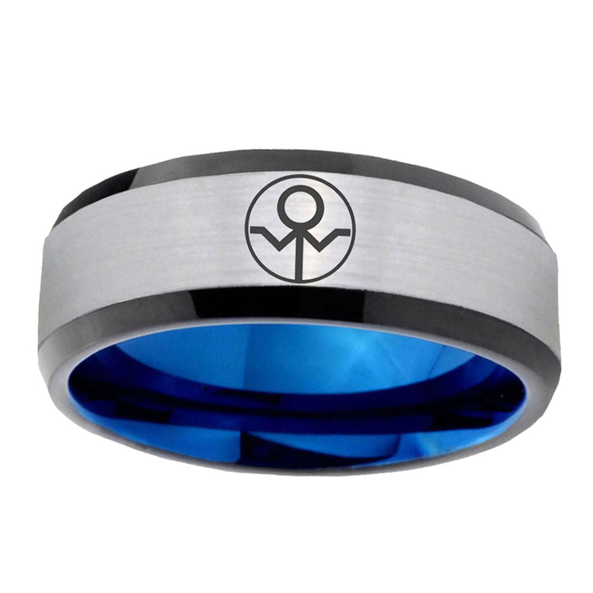 Introuding 6, 8mm Gray Lantern Beveled Edge Blue Silver Tunsten Ring . Offer in both 5mm and 8mm band width silver and blue plated finished from size 4 to 14