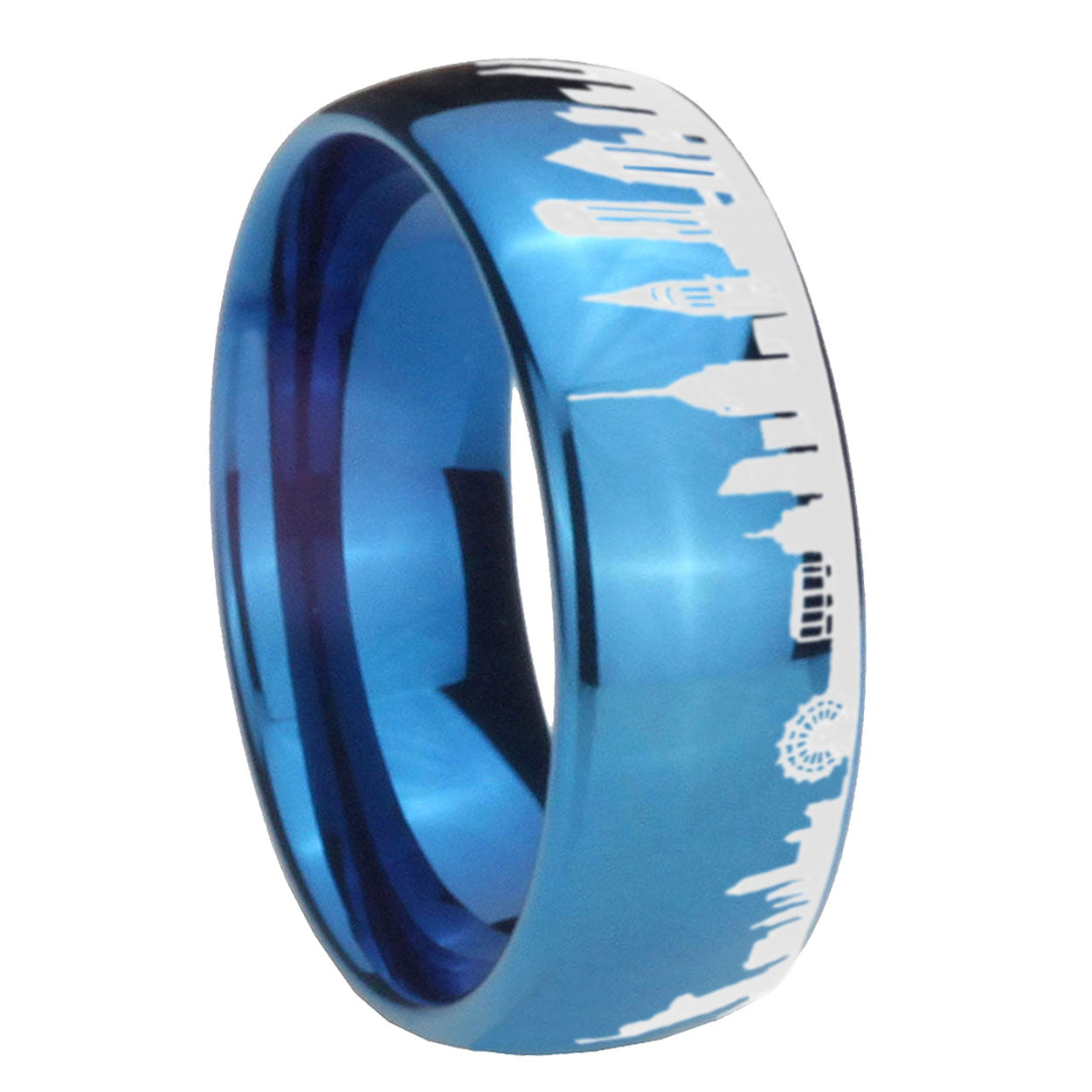 Intruding 8mm NY New York City Polish Dome Blue Mens Wedding Bands Engraved . Offer in 8mm band width polished blue plated finished from size 7 to 14