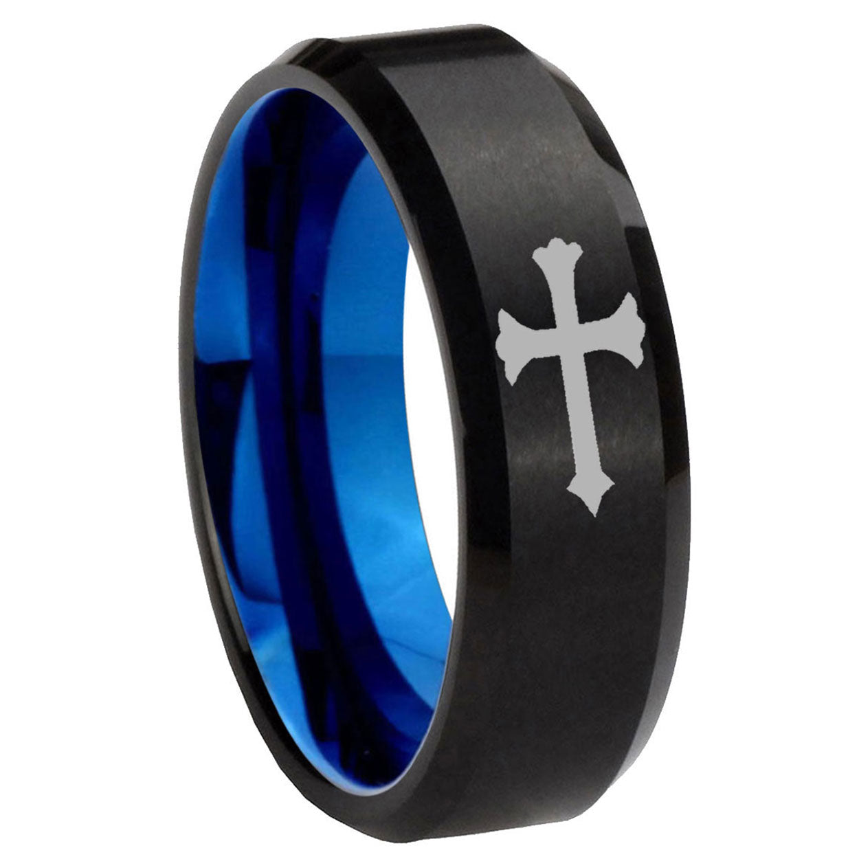 Intruding 5, 8mm Christian Cross Beveled Blue and Black Tungsten Men's Engagement Ring . Offer in both 5mm and 8mm band width Blue and Black finished from Size 4 to 14