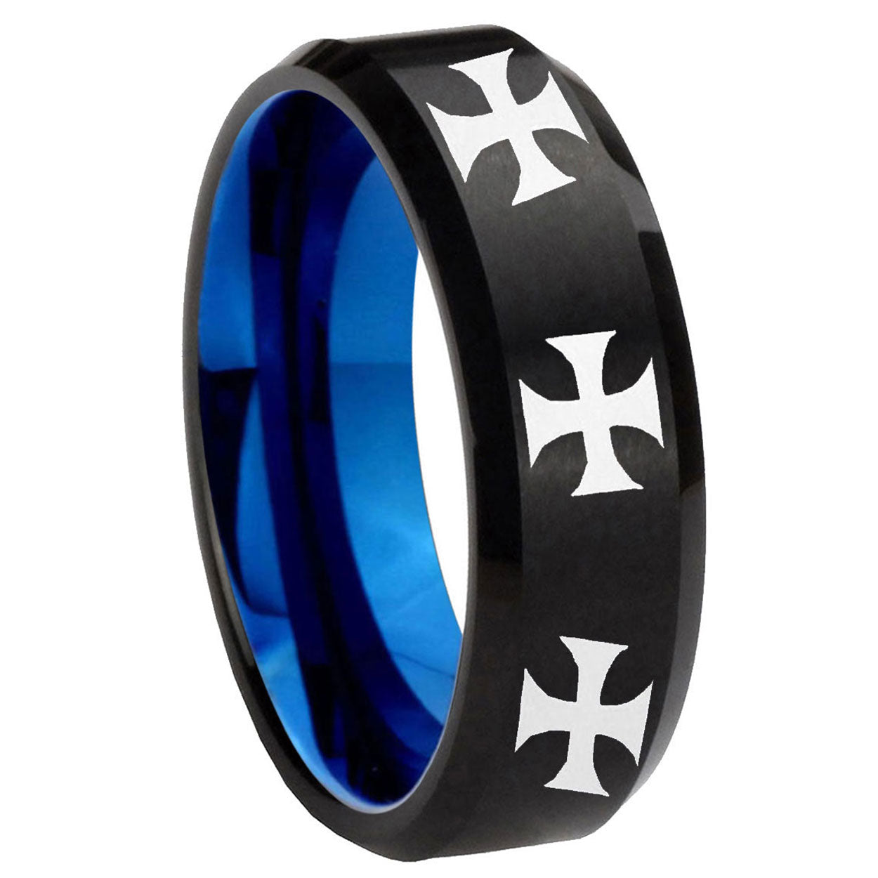 Intruding 5, 8mm Multiple Maltese Cross Beveled Edge Blue and Black Tungsten Bands Ring . Offer in both 5mm and 8mm band width Blue and Black finished from Size 4 to 14